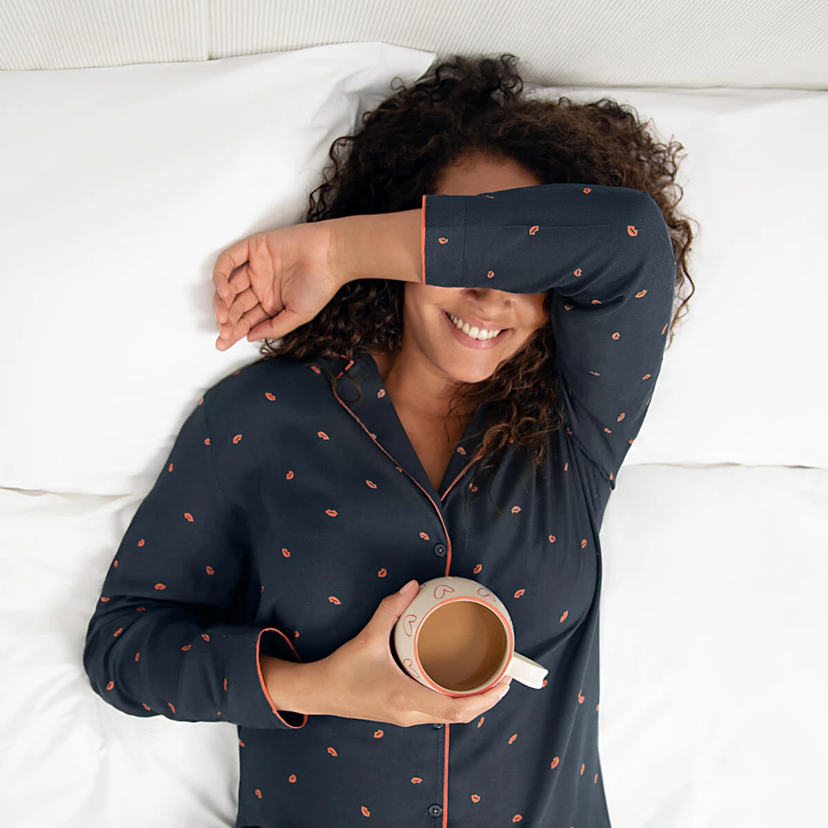 Enjoy the perfect night in wearing these lovely pyjamas which are covered in pink lips on a navy coloured ground. This ladies pyjama set includes pyjama bottoms which have practical pockets and an elastic waist, as well as a button style shirt pyjama top with a feature collar. It would make a lovely gift idea for her!