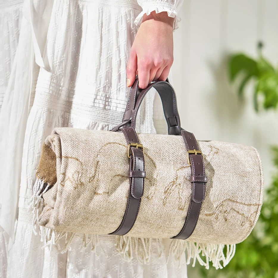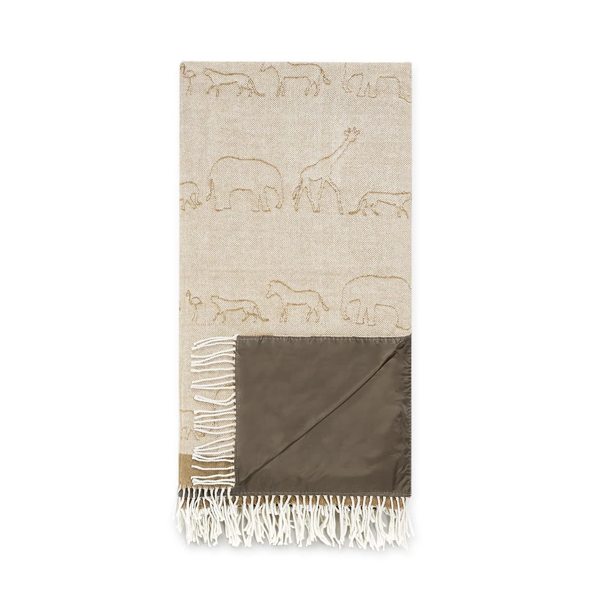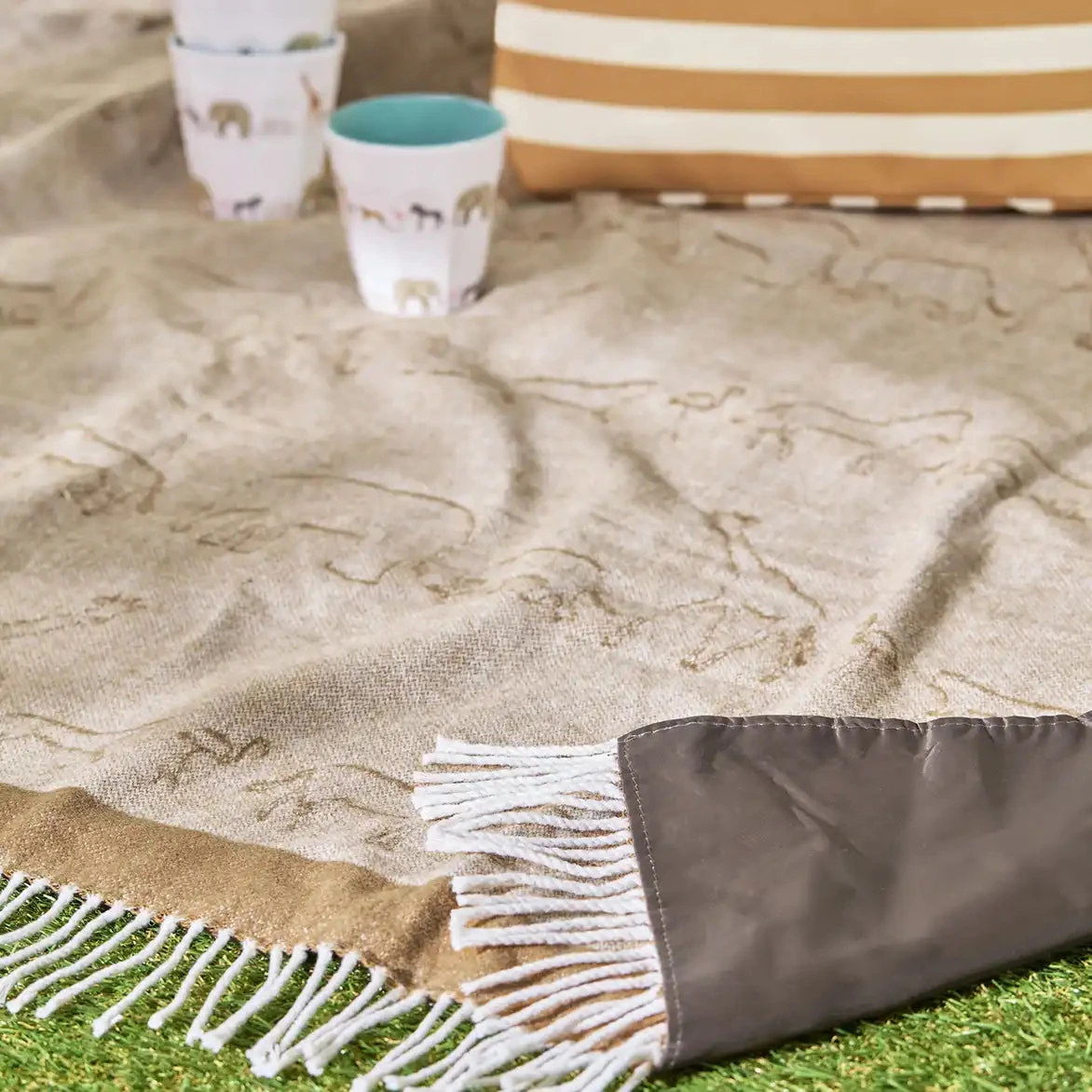 Add an adorable and classic touch to picnics in the park, beach trips, BBQs, and alfresco dining amongst friends with our inspiring Animals of the Savannah collection. A charming yet stylish summer essential, this practical picnic blanket is perfect for picnics in the park, beach trips, BBQs, and outdoor entertaining. Featuring Sophie’s delicate outlines of giraffes, elephants, cheetahs, zebras, and flamingos on a neutral ground with caramel edges, it is a fabulous choice for family days out or taking a snooze in the sun. The faux brown leather straps make it easy to carry around, whilst the brown water-resistant backing is perfect for keeping you and your belongings dry if the ground is wet.