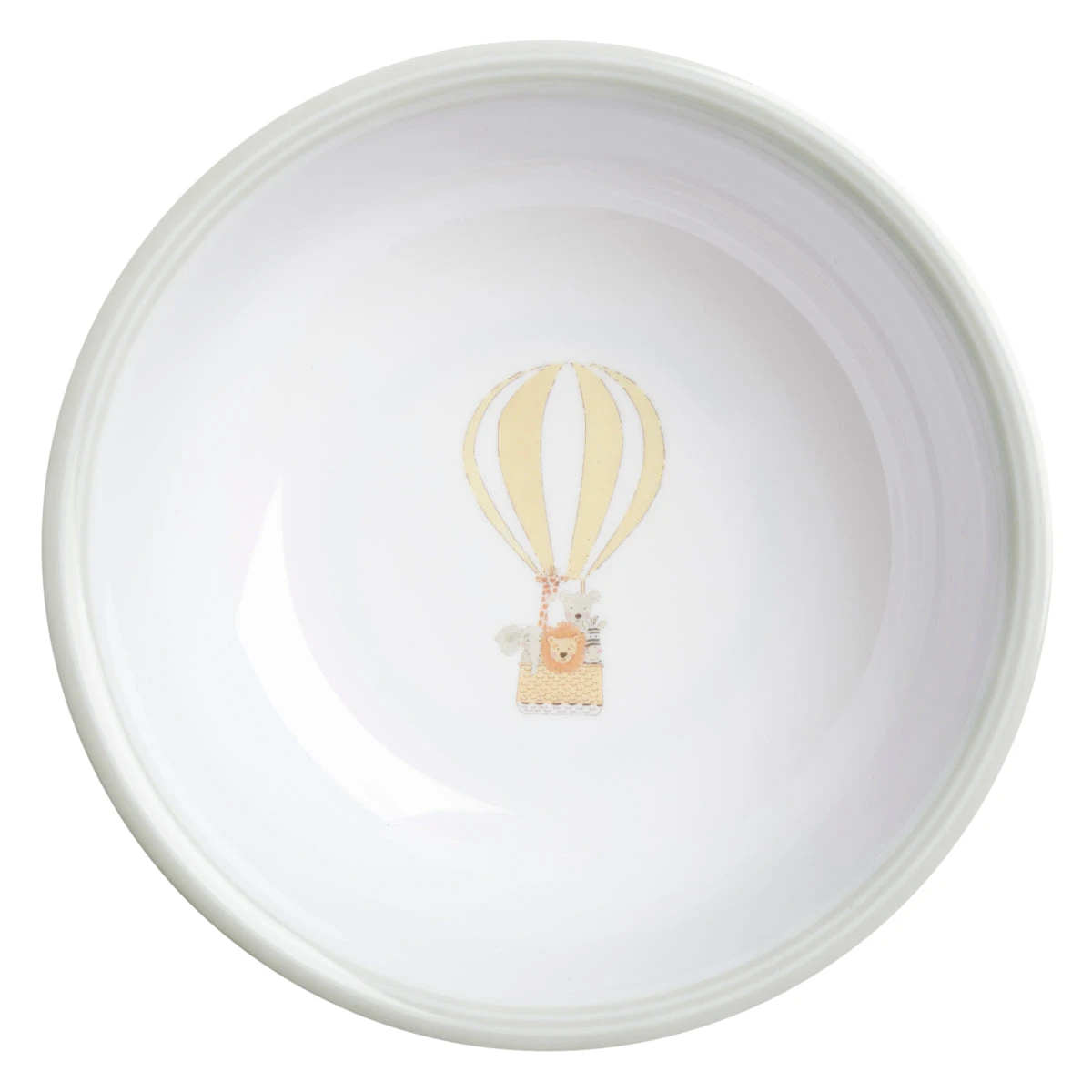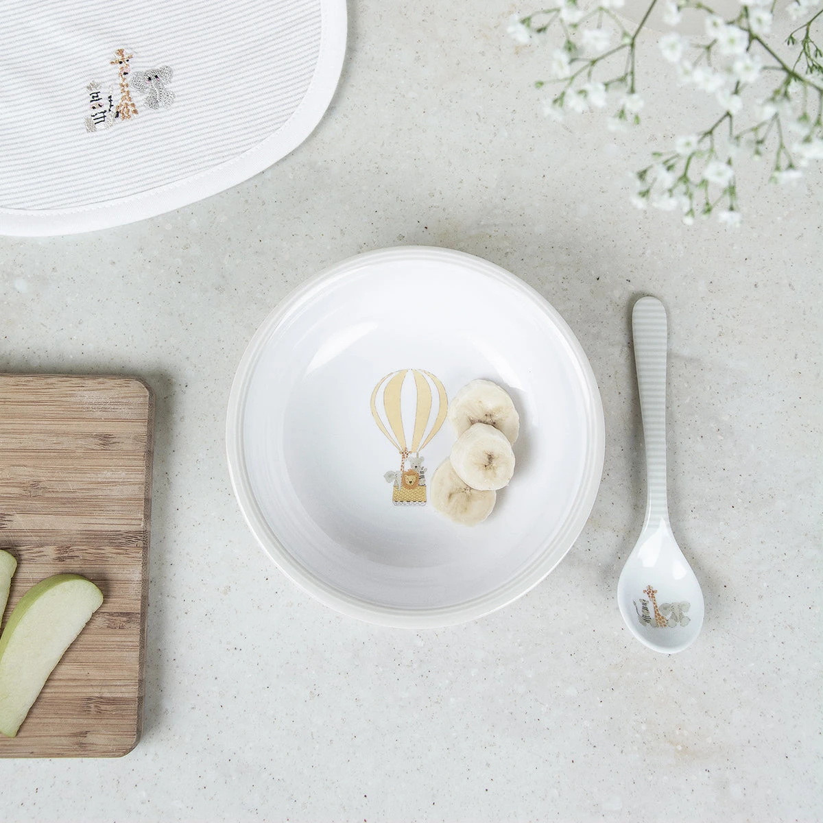 A lovely melamine bowl for children, featuring Sophie’s Bears and Balloons design, with an adorable zebra, elephant, teddy bear, giraffe and lion floating off in a hot air balloon. This lovely baby bowl is perfect for weaning and dinner times, finished with a pale oat edging.Â
