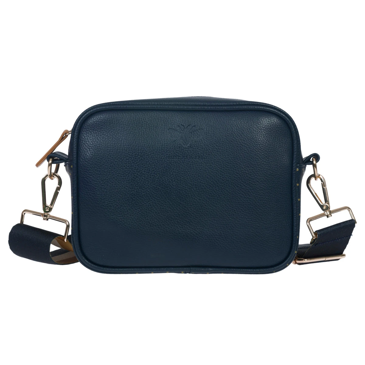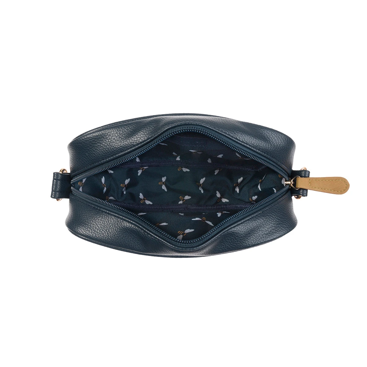 This navy camera bag is perfect for using as an everyday handbag or could even be used as an evening bag. This lovely bag is made from faux leather and features a stamped bee with the words ‘Busy As A Bee’ written on the front. The detachable strap has navy bee detailing and a part striped reverse.Â