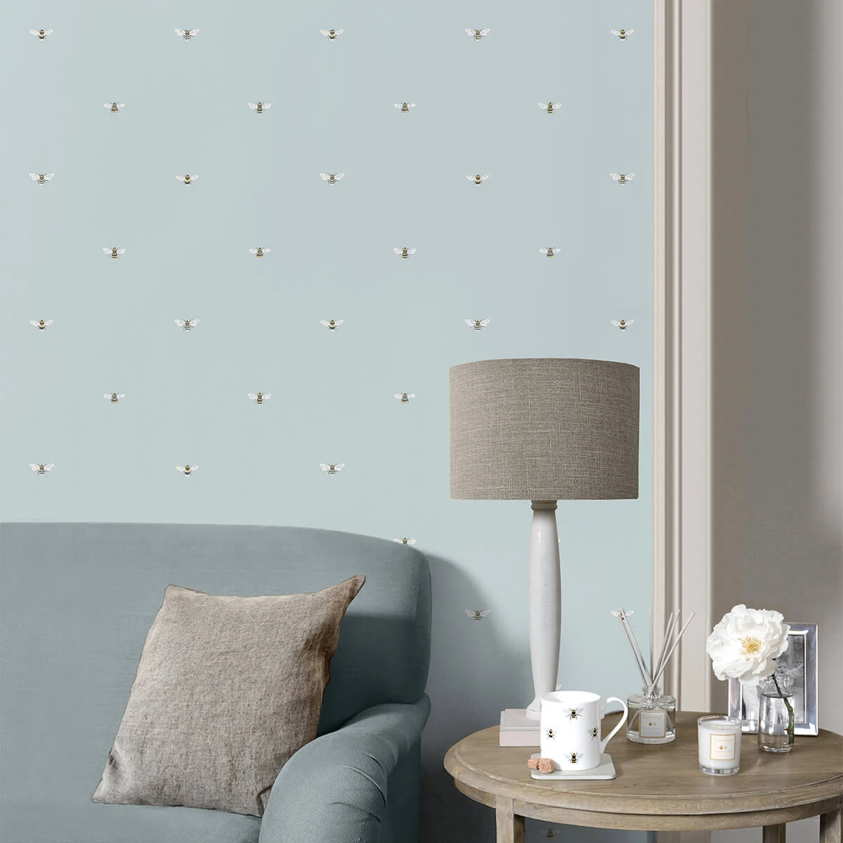 Add a touch of colour to your home with this beautiful wallpaper which features Sophie’s popular bees design on a duck egg coloured background. Perfect for living rooms, bedrooms, hallways, kitchens and dining rooms.
