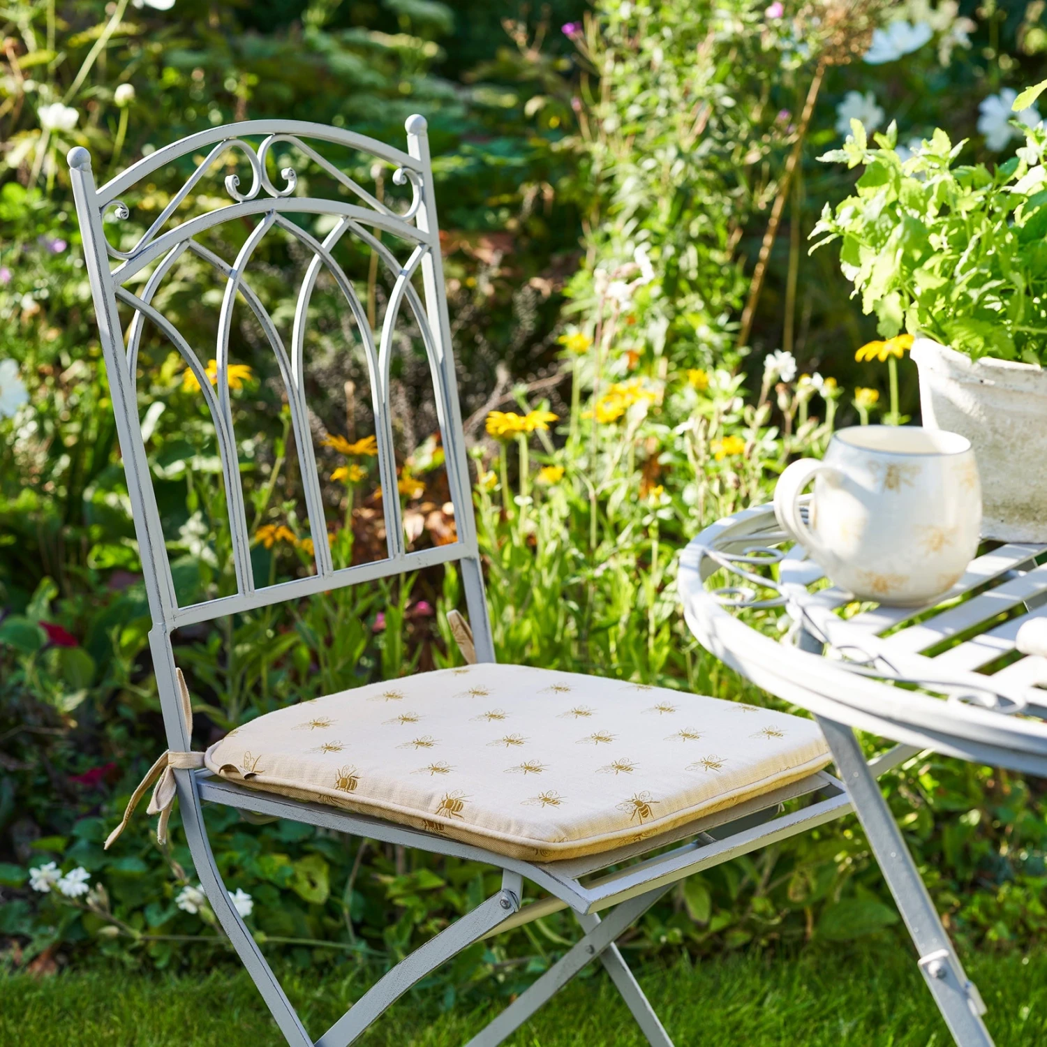 Add extra comfort to your kitchen or dining seating with this lovely linen seat cushion in Sophie’s distinctive mustard yellow Bees print. You can also take it outdoors to use with your garden chairs and it looks great with a bistro set.
