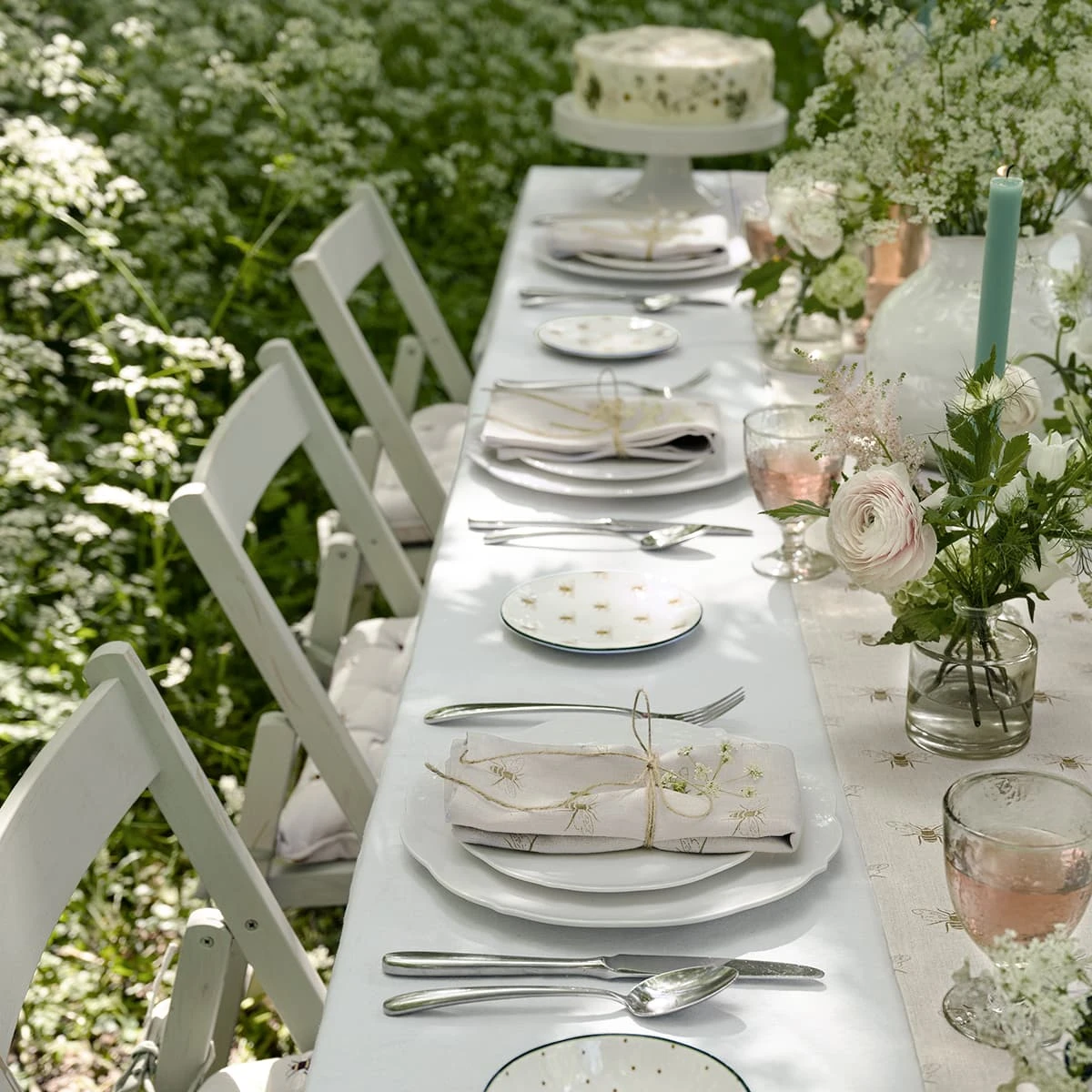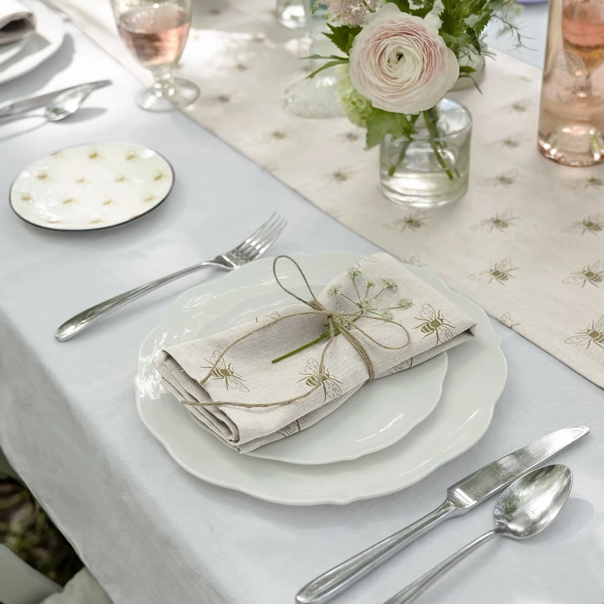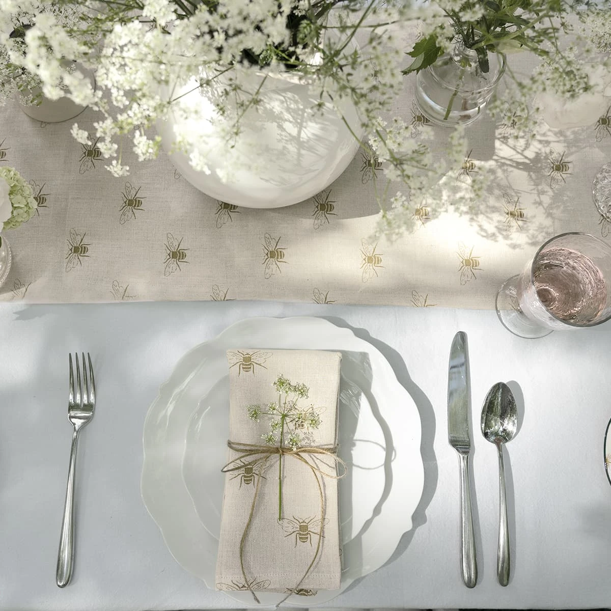 A timelessly beautiful table runner made from 100% linen. It’s sure to add charm to any table setting and is perfect for dinner parties all year round. Sophie’s buzzing bees add a touch of nature whilst the neutral colourway works with many home interiors and will make a stylish statement. Linen is known for its strength and durability and is also hypoallergenic, making it suitable for those with allergies and sensitive skin. It’s also naturally anti-bacterial and will soften over time. Pure linen fabrics will have ‘slubs’, these imperfections are signs it’s made from true linen fibres and not a polyester mix.Â