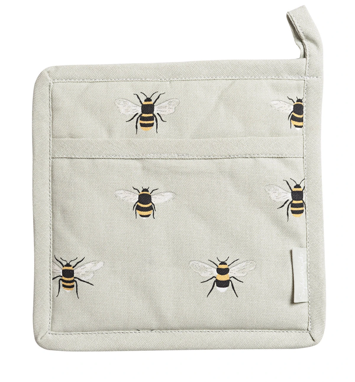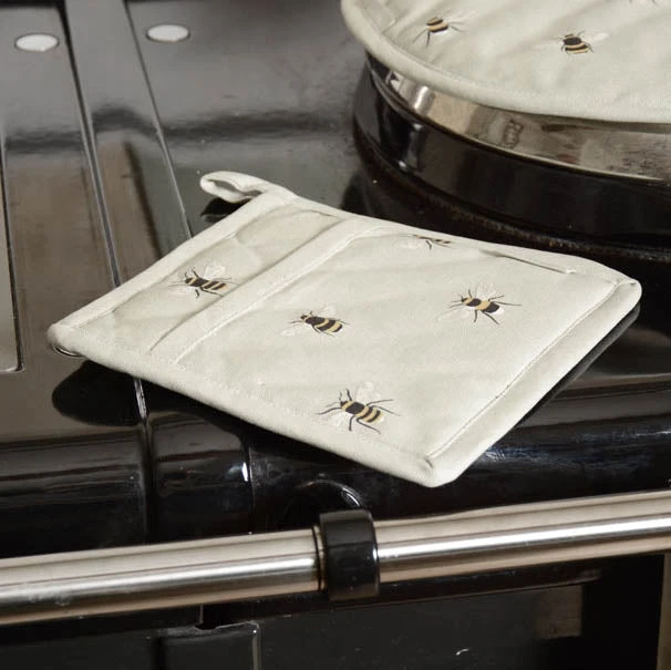 Our Bees pot grab will protect your hands while lifting hot pans and dishes. Covered in bees on a pale green background, it is made from 100% cotton and the internal padding gives you excellent insulation. Why not consider a matching Bees Apron or Bees Tea Towel from the collection.