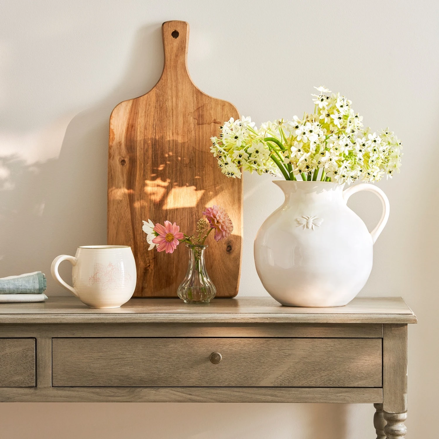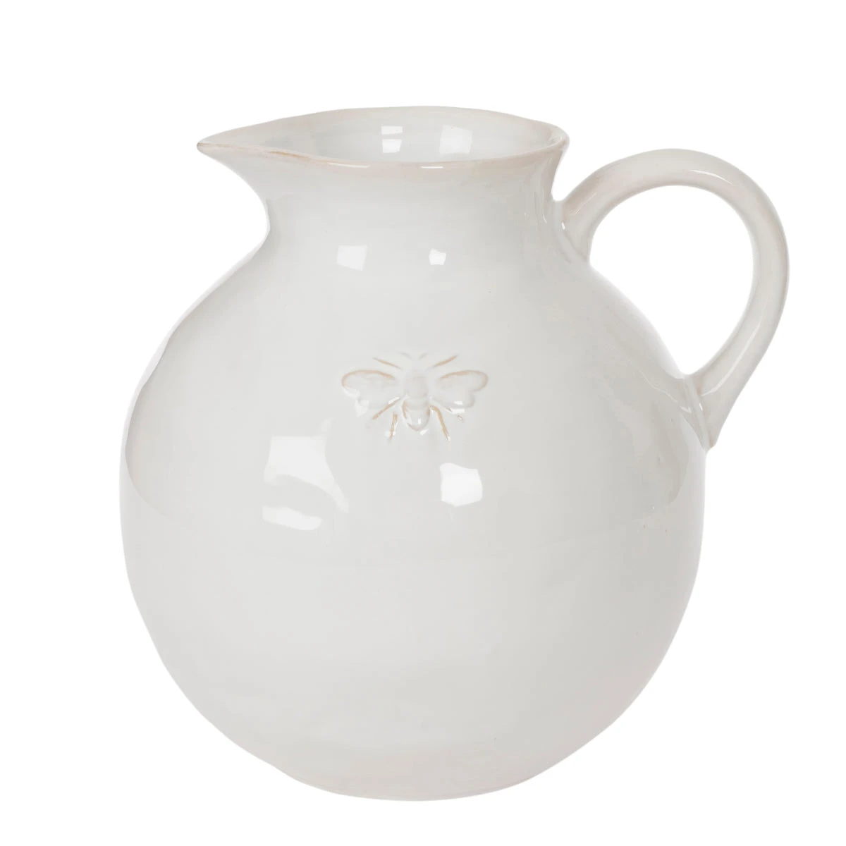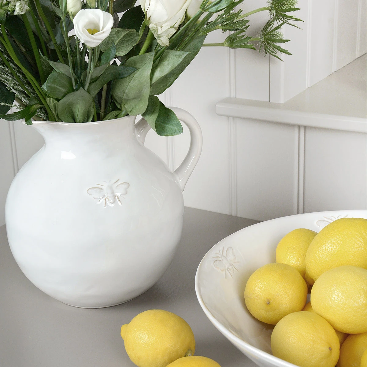This beautiful white stoneware jug makes a lovely feature to any home. It makes an excellent vase, just fill it with a colourful bunch of your favourite flowers for a beautiful display. The white design makes it elegant and perfect for everyday use and features an embossed bee design in the centre.Â