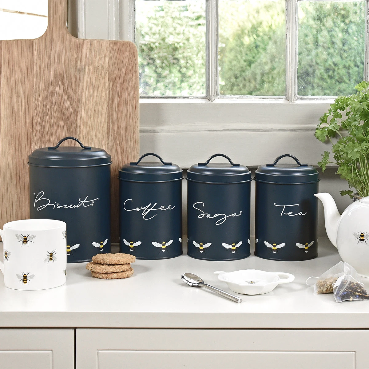 Perfect for tea lovers, this midnight navy bees tea storage tin is made from galvanised steel. Perfect for storing your Earl Grey, Lady Grey, Builders, Green or Peppermint Tea. Making a stylish statement on your kitchen worktops and ideal for country kitchens. Bees buzz around the base of this tin and the word ‘Tea’ is written on the front in Sophie’s signature handwriting. Also available as a set of three – tea, coffee and sugar.