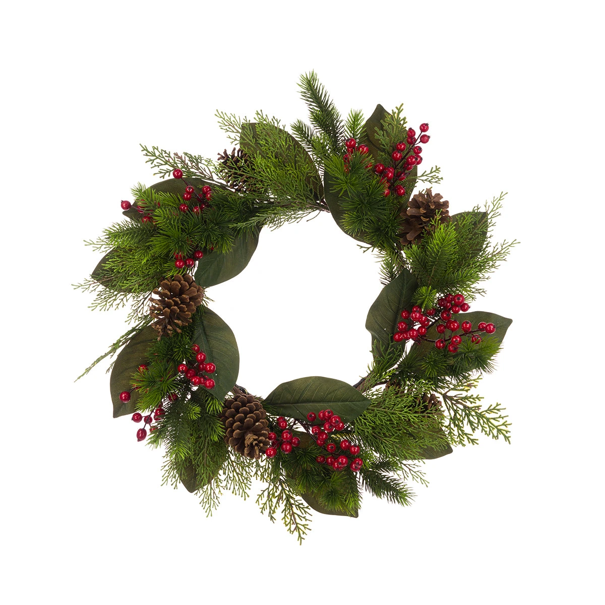 This beautiful faux berry and pinecone wreath has realistic looking leaves and foliage and is dotted with luxurious red berries and pine cones for a festive look. Excellent for hanging on your door or use as a centrepiece on your table setting with a vase in the centre.Â