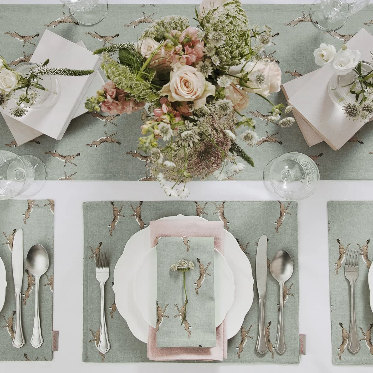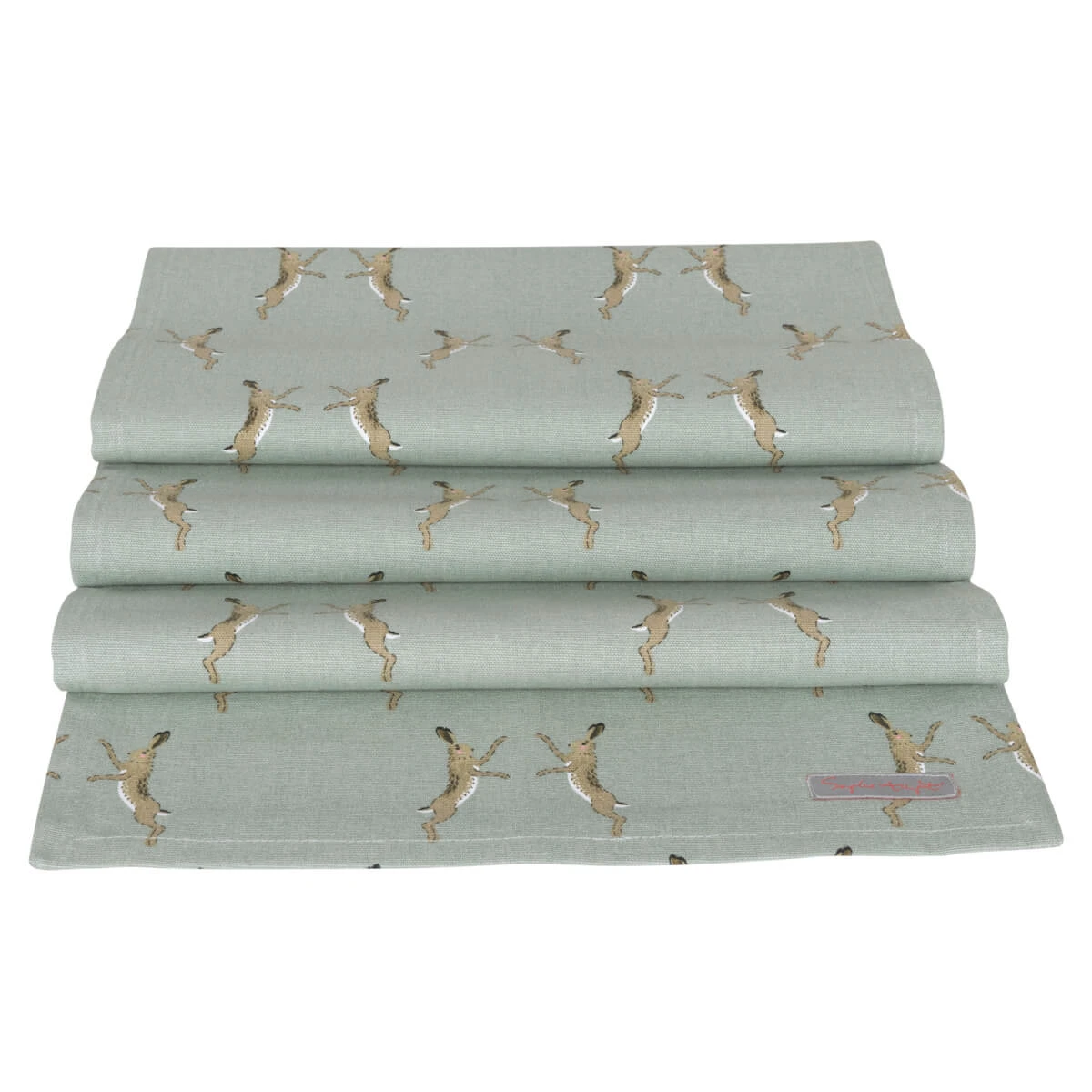 This charming table runner is sure to add a stylish country look to your table setting. This lovely design features the wildlife spectacle of boxing hares on a duck egg grey cotton ground, which can be often seen during the spring months and is inspired by the hares seen in the fields close to Sophie’s home in rural Lincolnshire.