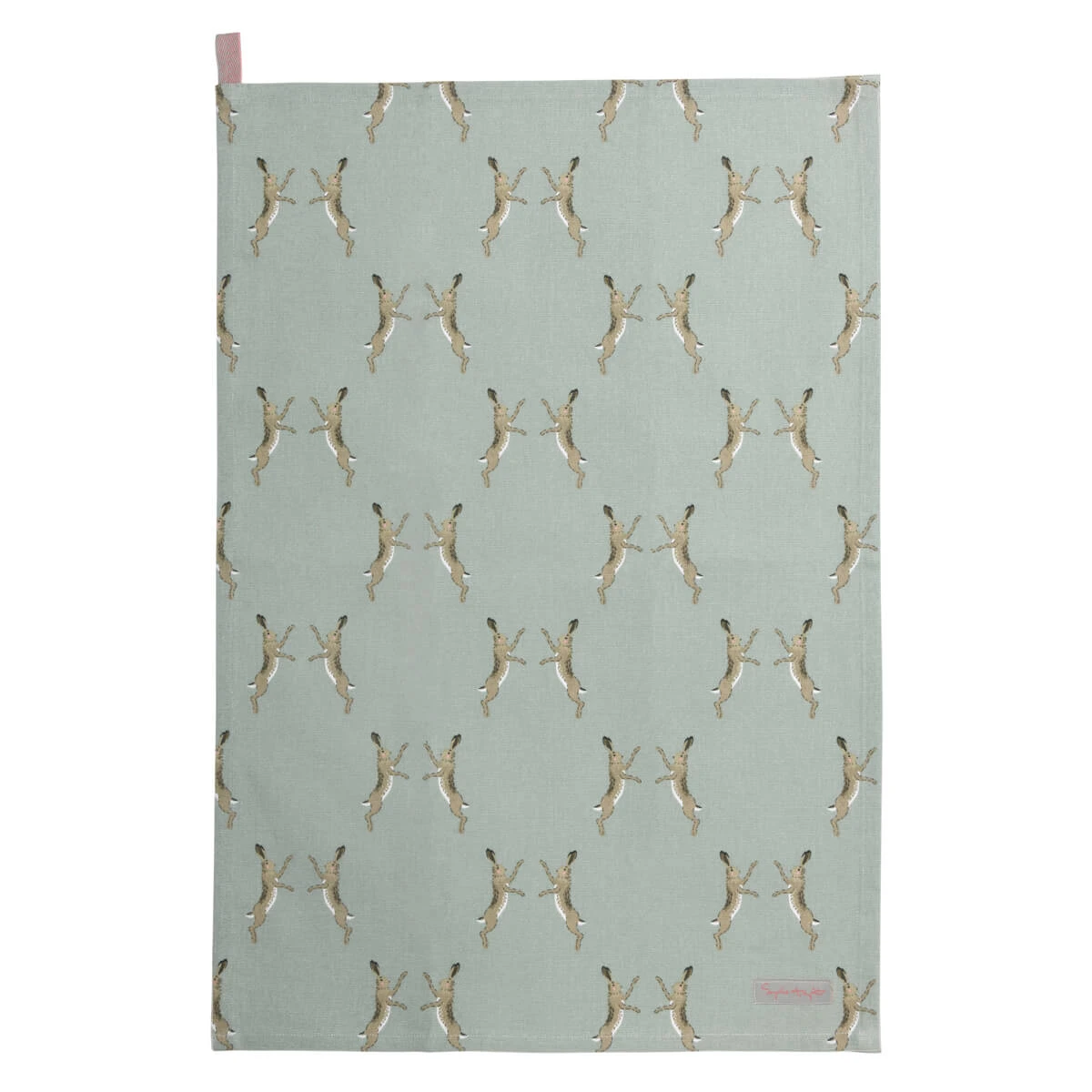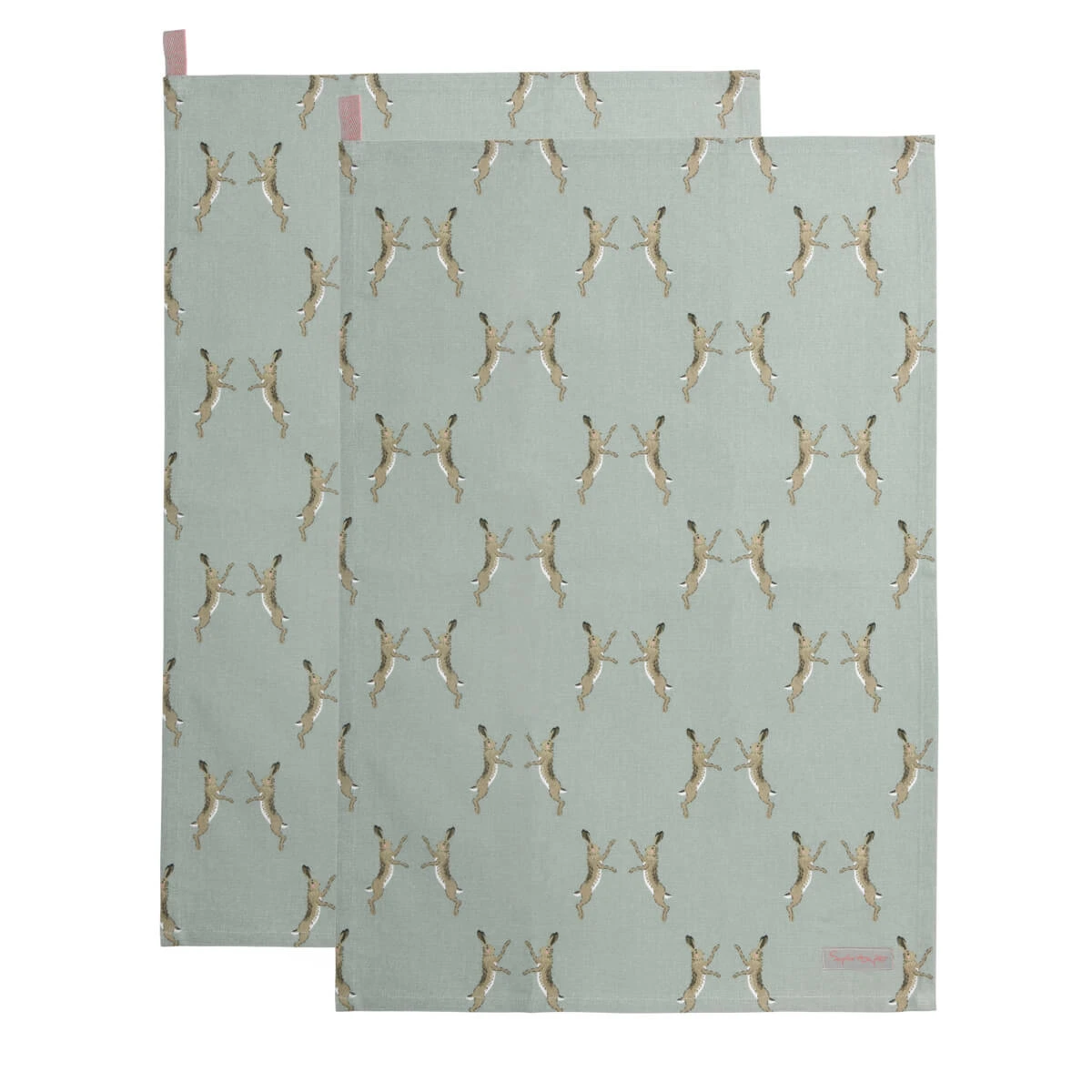 A pair of practical cotton tea towels in Sophie Allport’s beautiful Boxing Hares design. A charming design on a duck egg grey cotton ground that features the wildlife spectacle of boxing hares, which can be often seen during the spring months and is inspired by the hares seen in the fields close to Sophie’s home in rural Lincolnshire. These lovely tea towels are sure to add a stylish country look to any kitchen. There is a handy ‘loop’ on each top left corner, so you can hang them up.