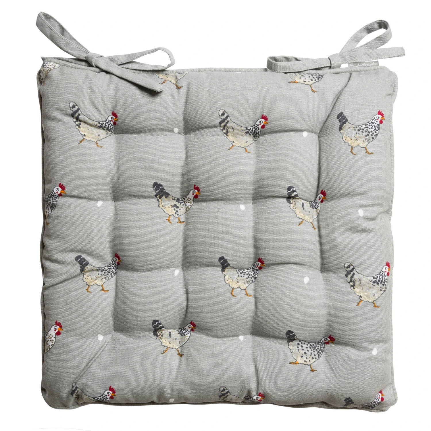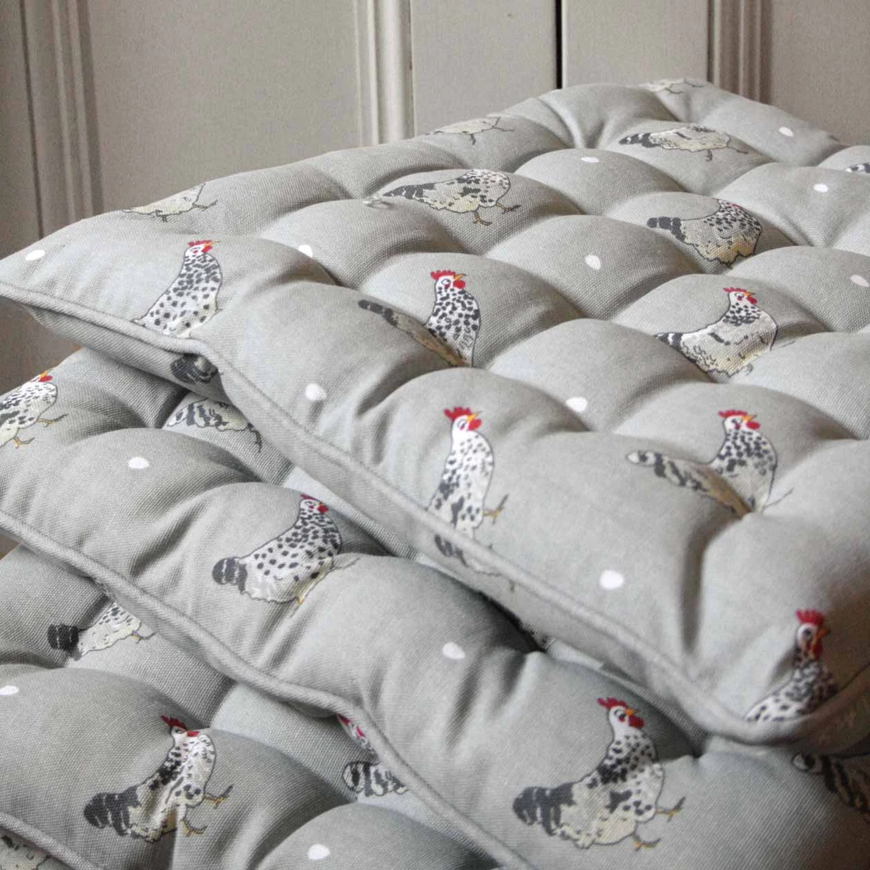 These adorable Chicken Chair Pads are 100% cotton and will smarten up any seat and make it extra comfy. They can be used as kitchen chair pads, seat pads, dining booster cushions and garden seat cushions. Made from our lovely sage grey Chicken fabric, they are covered in quirky Speckled Maran Hens with a few white eggs dotted around. Perfect for country chairs in the garden, sun room, bedroom, kitchen or dining room and coordinate beautifully with our Chicken collection of china and textiles.