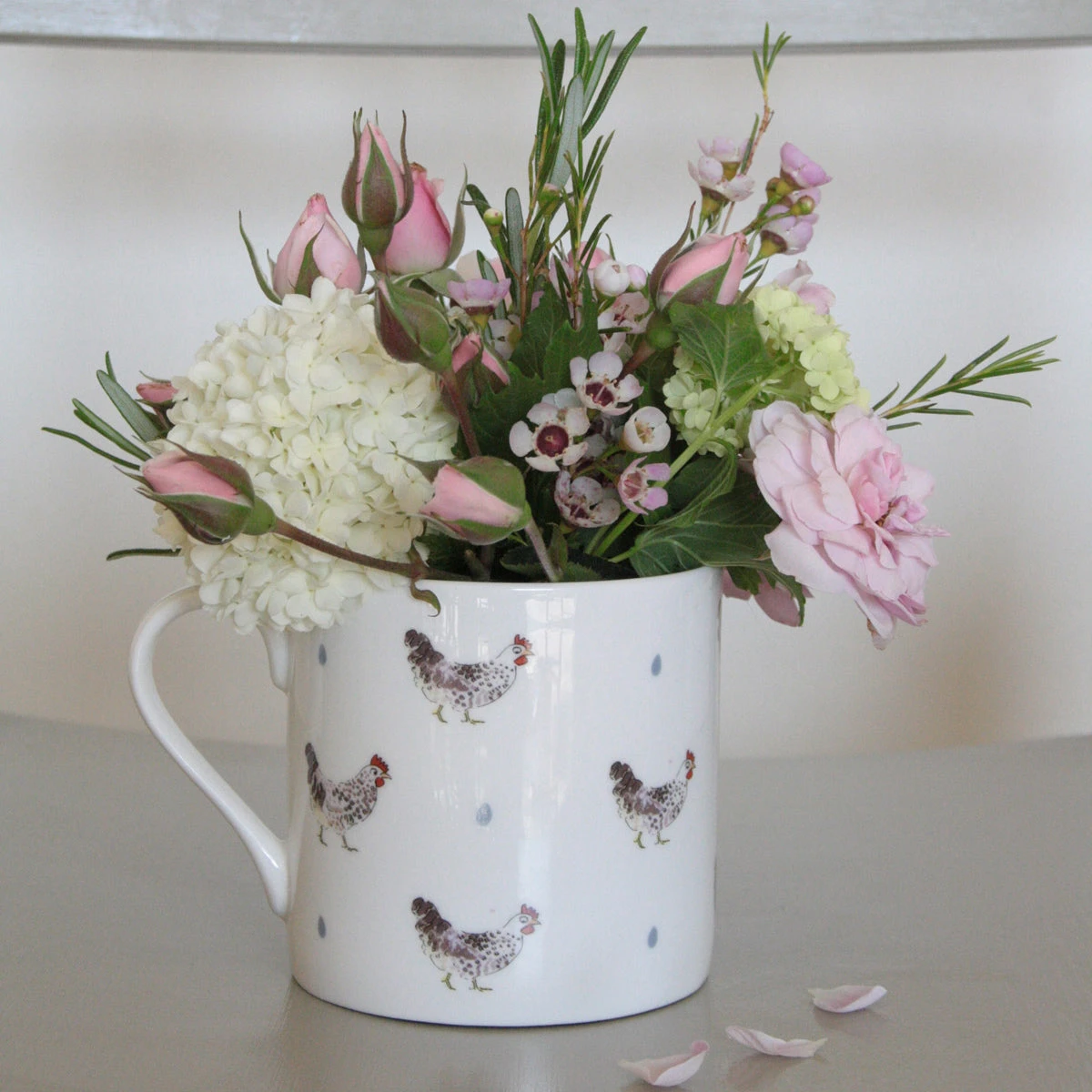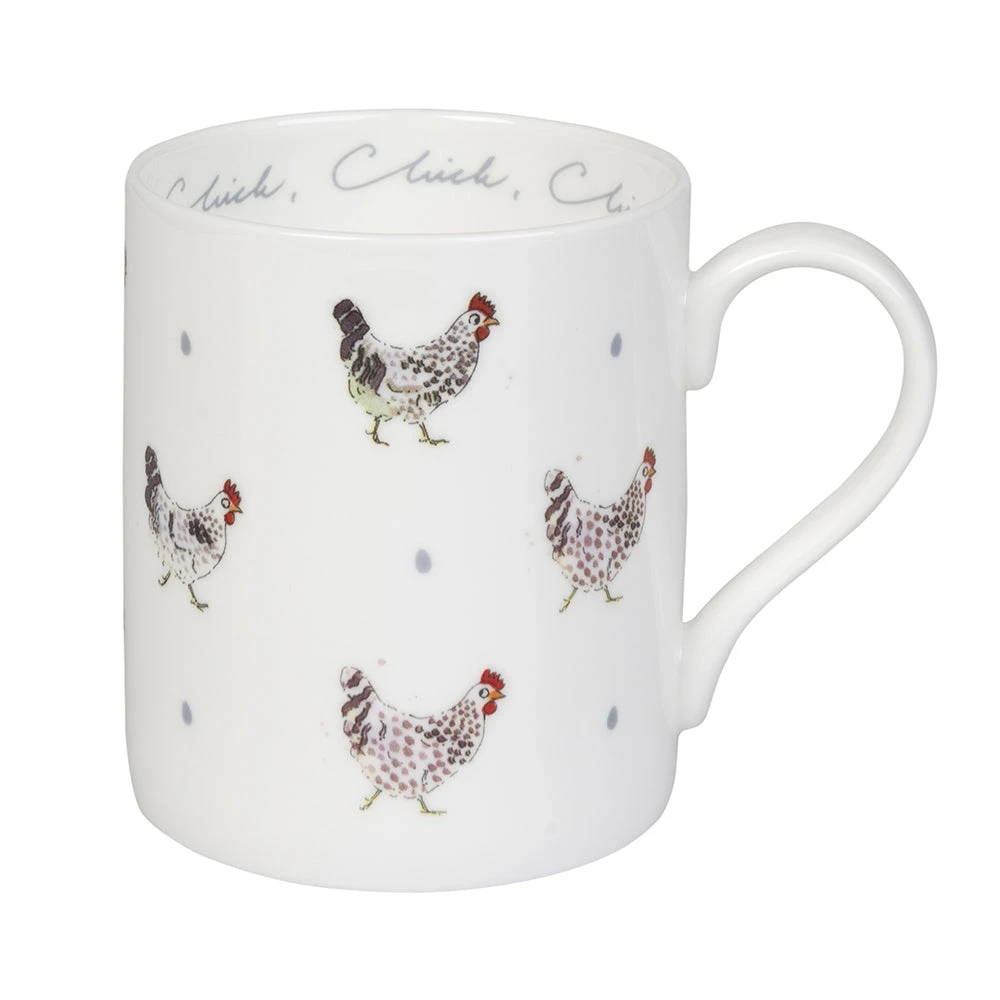 A quirky chicken mug covered in Speckled Maran hens on a white background with a few grey eggs dotted around. It would make a lovely gift for a hen keeper or chicken enthusiast. Perfect Easter gift.