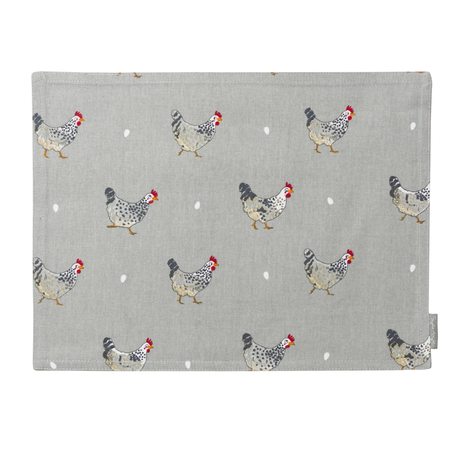 Decorate your dining or kitchen table with these wonderful Chicken fabric placemats, part of our Chicken collection. These placemats make it so easy to turn an ordinary breakfast, lunch or dinner into a slightly more special event. They’d also smarten up a summer dining table outside in a country garden. The sage grey placemat is covered with quirky Speckled Maran hens and a few white eggs and perfectly complements our Chicken fine bone china plates. The reverse of the placemat is plain sage grey.