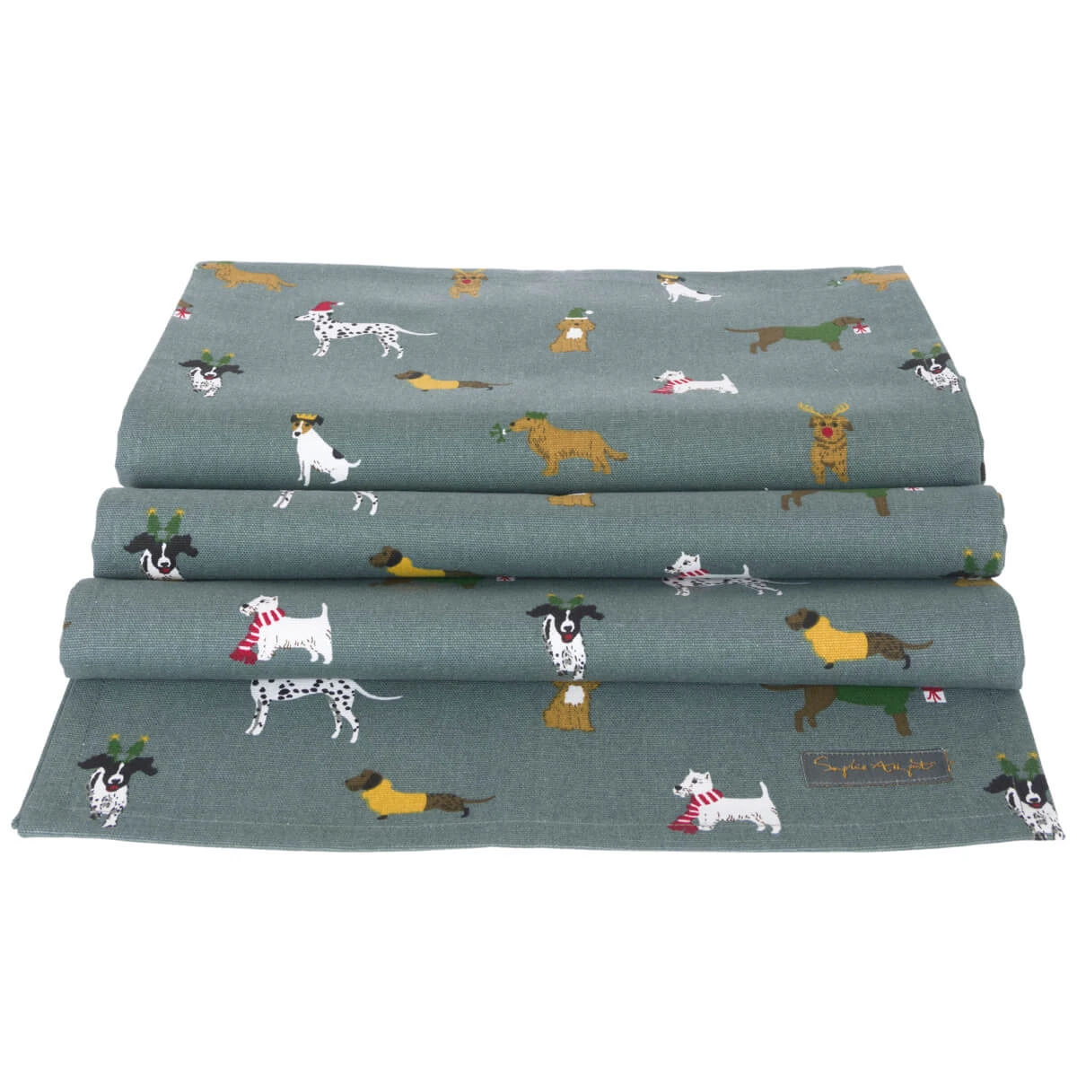 Bring the pawty to your table this Christmas with this adorable table runner which is covered in some of our favourite festive dogs on a winter teal background. Perfect for dog lovers and owners, this table runner will add a seasonal delight and is sure to put a smile on your guests’ faces around the dinner table. Made from 100% cotton, it pairs perfectly with the matching napkins and fabric placemats from our Sophie’s Christmas Dogs design.Â