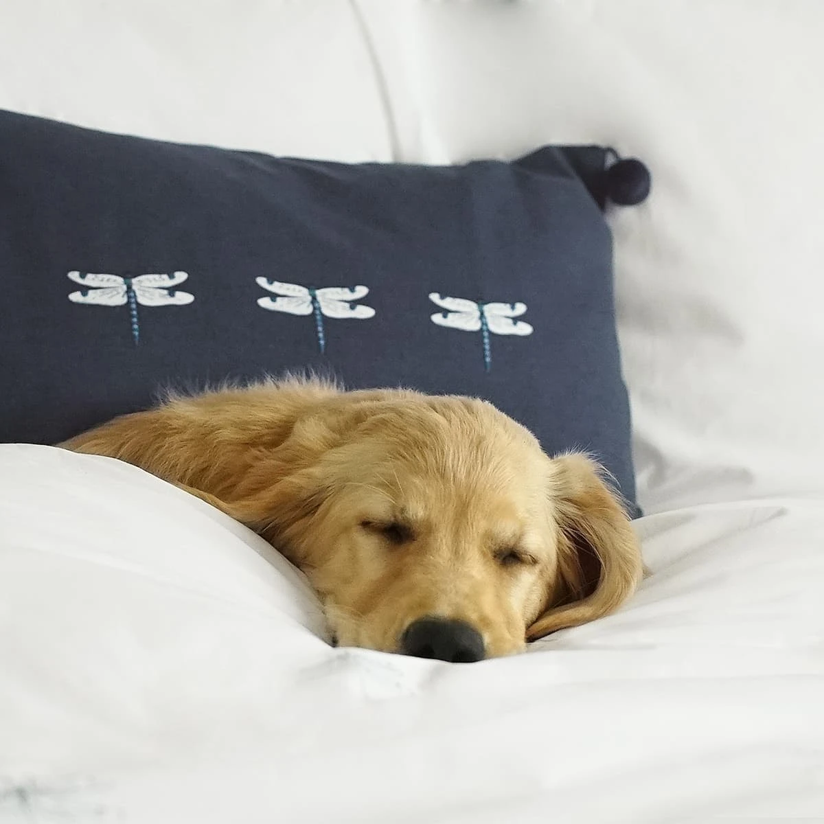 Three striking embroidered dragonflies sit centrally against the contrasting midnight blue background, on this stylish decorative cushion. It’ll look lovely in a sitting room or bedroom and is finished with small pompom corner detailing.