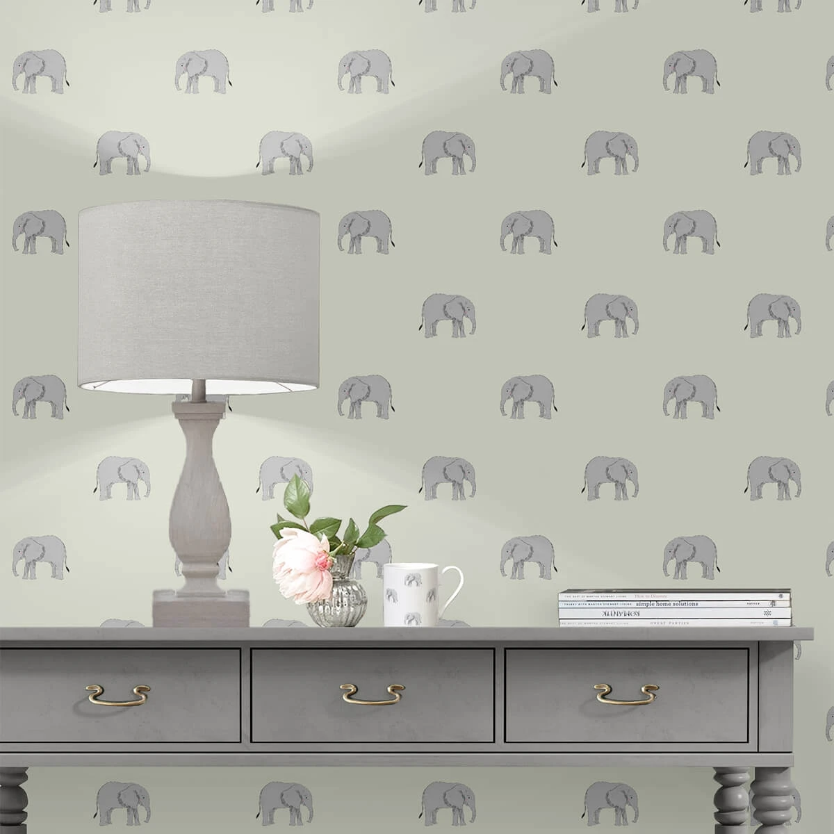 This stunning wallpaper features Sophie’s magnificent elephant design on a sage coloured background. Spot the rosy cheek and playful smile which adds a unique touch to this lovely design.