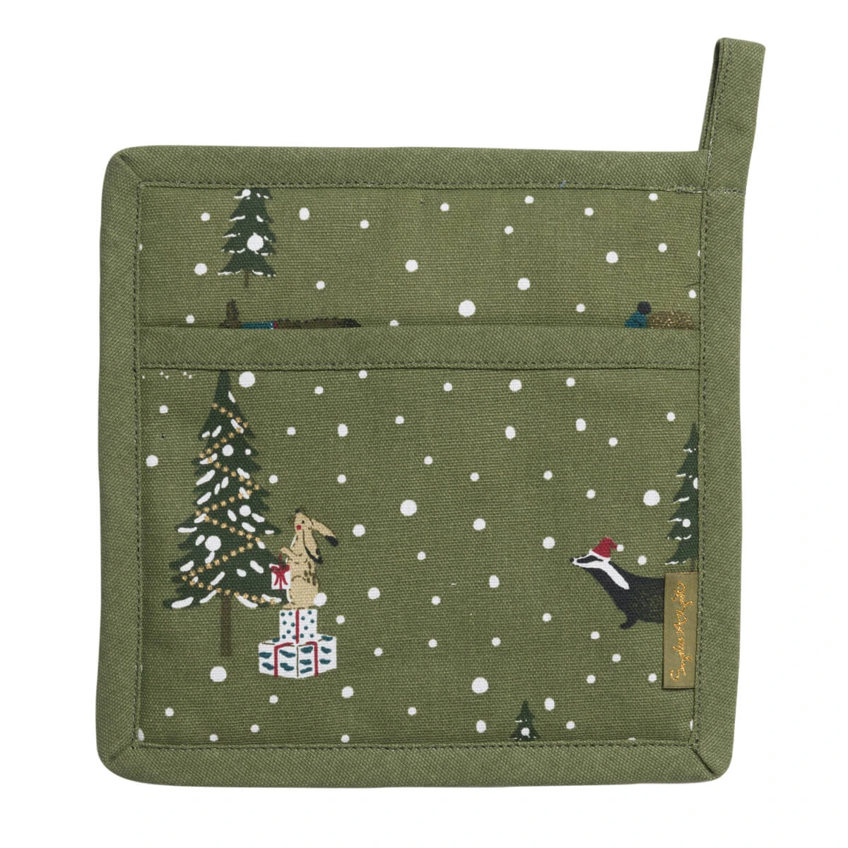 A practical and essential kitchen accessory, perfect for moving pots and pans around the kitchen. This pot grab is sure to add some festivity to your kitchen, dotted with hedgehogs, badgers, hares and squirrels in a snowy festive forest on a rich olive ground. Made from 100% cotton with internal padding for excellent insulation.