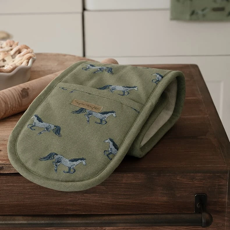 This gorgeous pair of double oven gloves are made from the charming Grey Horse design fabric, which features magnificent grey horses galloping on a moss stone green ground. The gloves will make a stylish statement in any kitchen and the polyester thermal layer makes them ideal for shuffling pots and trays around your kitchen, while the handy ‘loop’ in the middle of the glove allows you to hang them up.