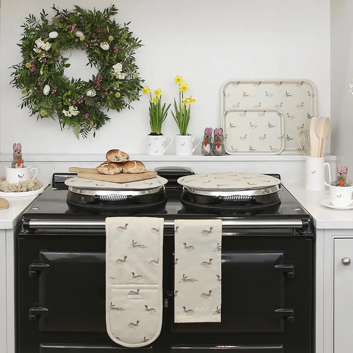 Sold as single, these lovely Hob Covers in our Hare design are great for keeping your prized cooking stove clean and scratch-free. They are also effective at keeping the heat in. Perfect in any country kitchen! The design features brown hares racing over a stone coloured background. They will protect the shiny stainless steel lids on your hobs.