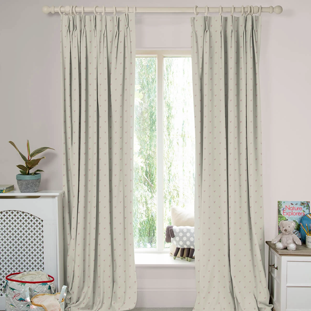 Add some love to your home with these made to measure curtains! Perfect for adding texture and comfort to any home interior, these beautiful curtains are dotted with blush coloured hearts on a neutral background. Â
