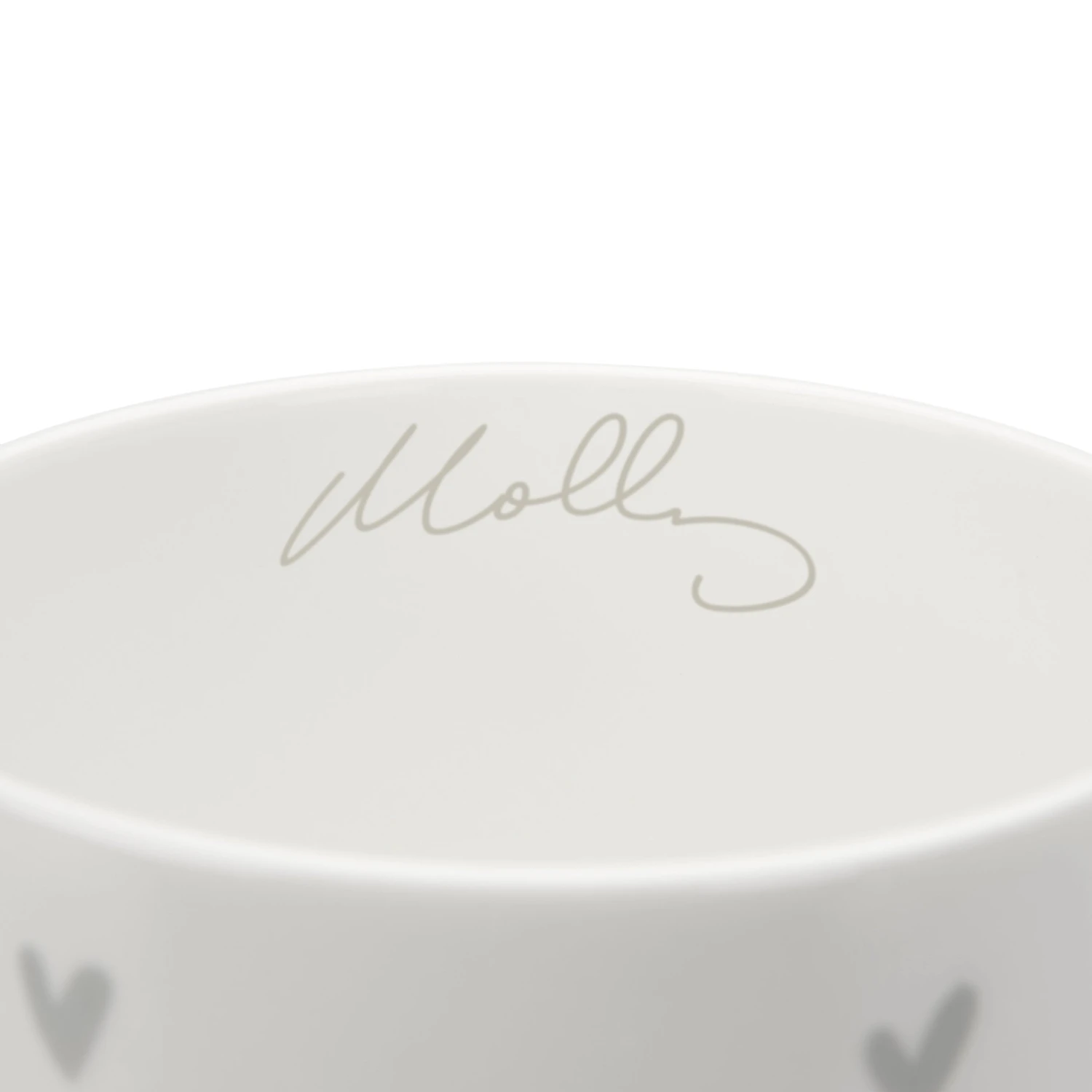 This white fine bone china mug, covered in small grey hearts, makes the perfect gift. Hand decorated and finished in the UK, it will brighten up every cup of tea or coffee.