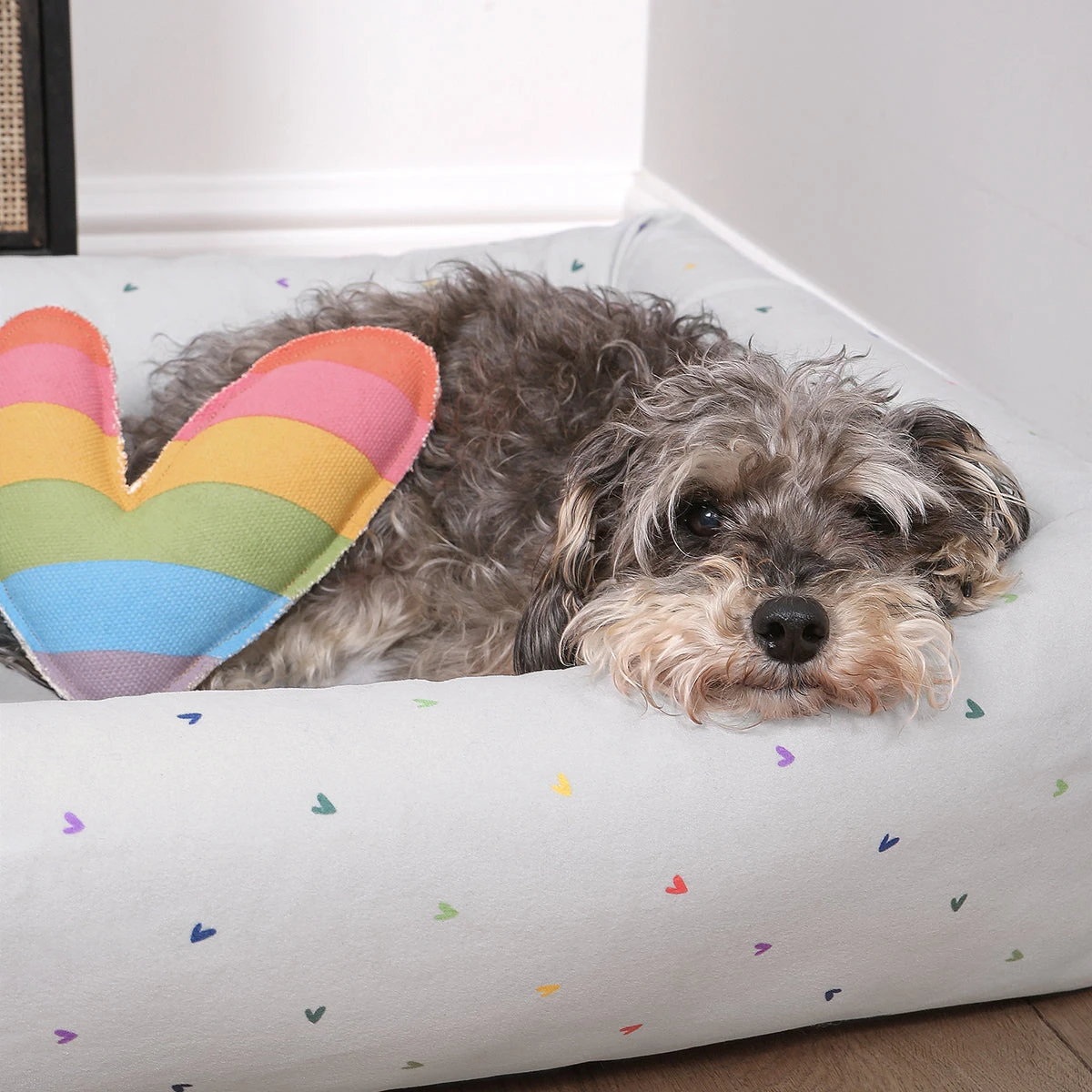 A wonderful place for your beloved pet to curl up after a long day! This cosy pet bed features colourful hearts on a neutral grey background with a super soft velvet cover and padded sides for extra comfort. An excellent bed for your dog or cat.Â