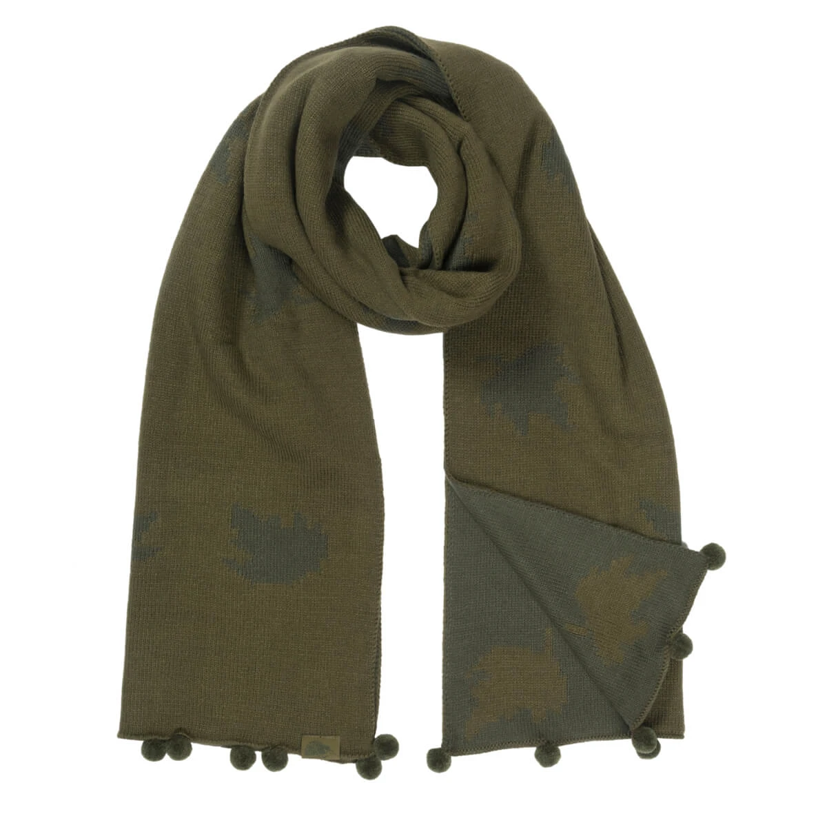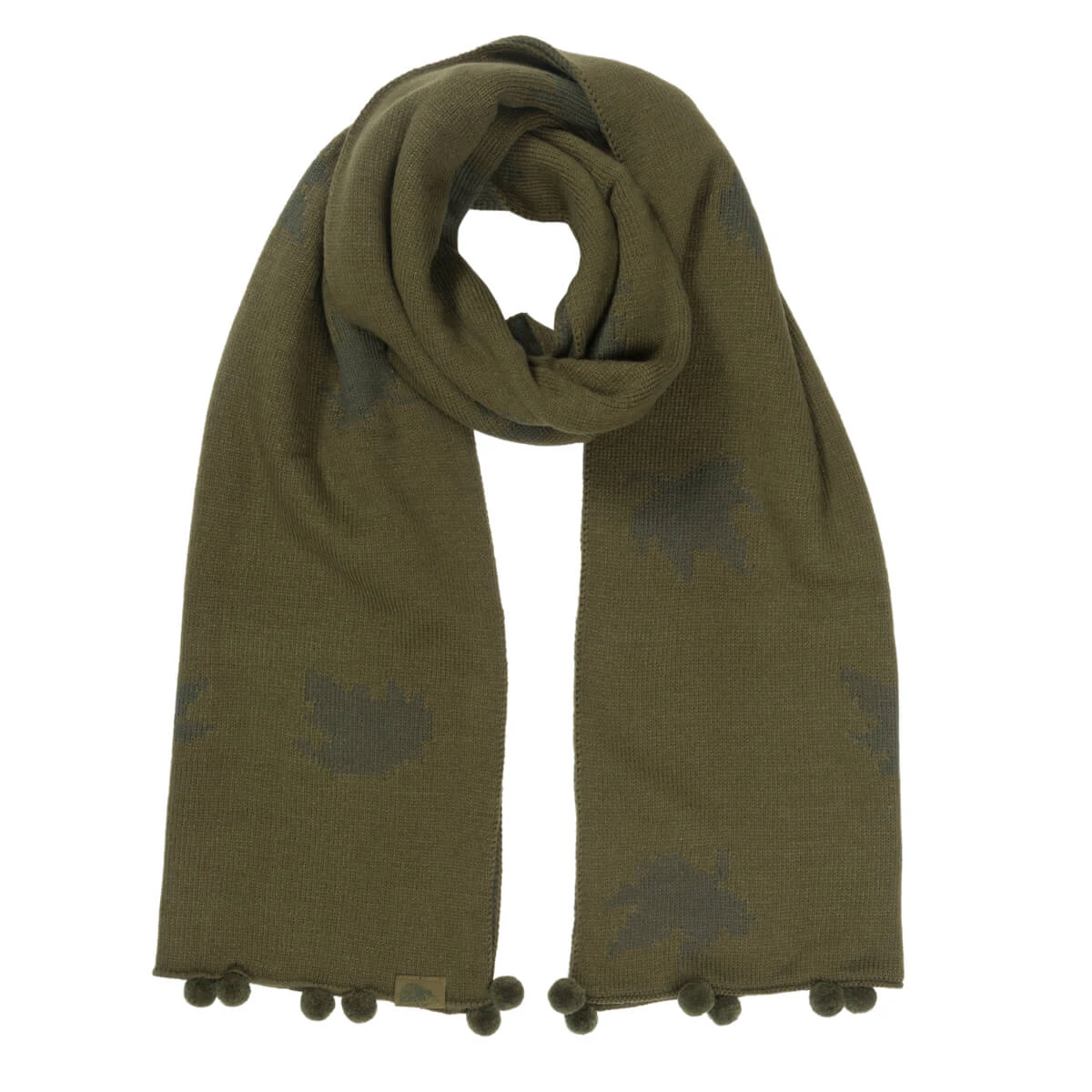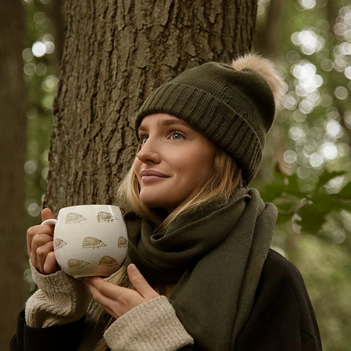 This cosy knitted scarf has a pretty pompom detailing trim and features Sophie’s illustrations of charming hedgehogs. Perfect for autumn and winter, it is a lovely khaki green colour featuring a subtle dark green autumn leaf pattern. Perfect for wrapping up warm on long chilly walks.Â