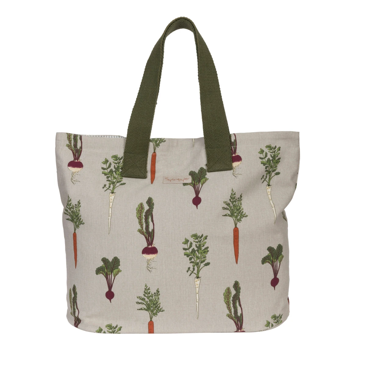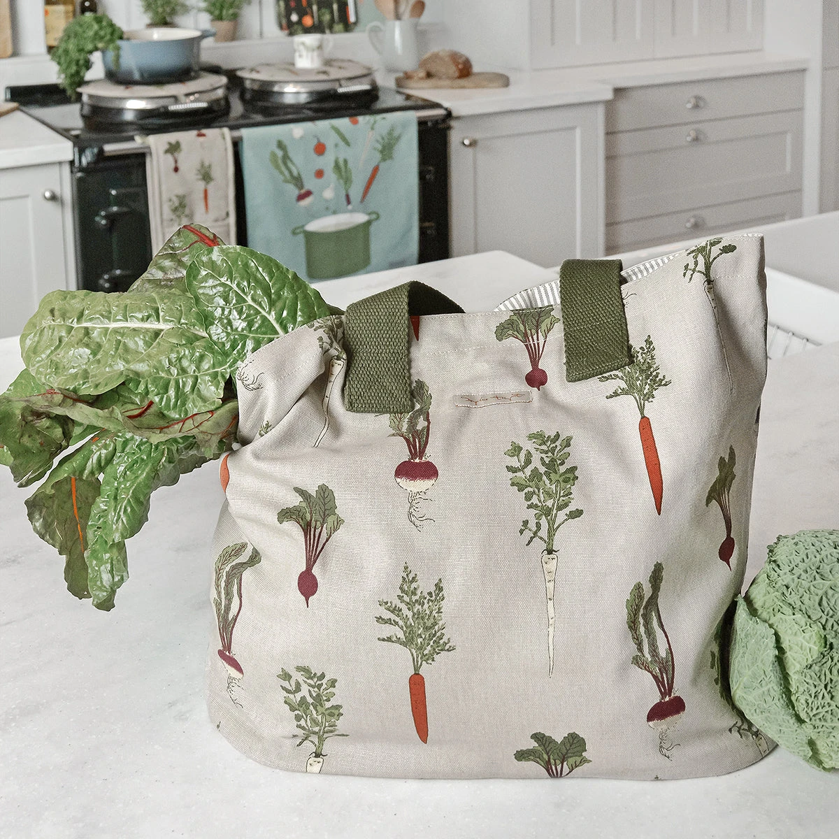A wonderful lightweight bag which is perfect for everyday use. Excellent for those who love vegetables, this lovely bag features some of our favourite wholesome veg, with parsnips, carrots, beetroot and turnips on a pale linen coloured background.Â