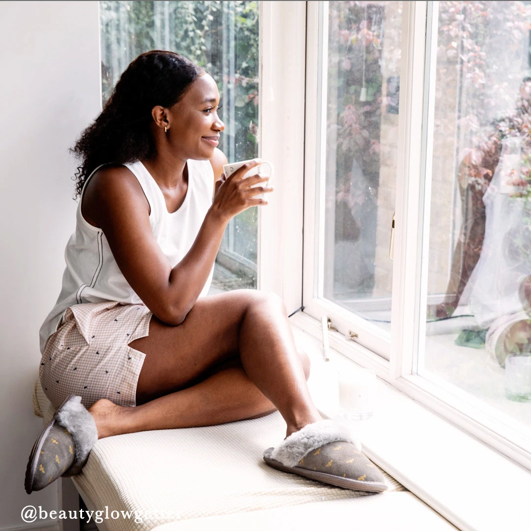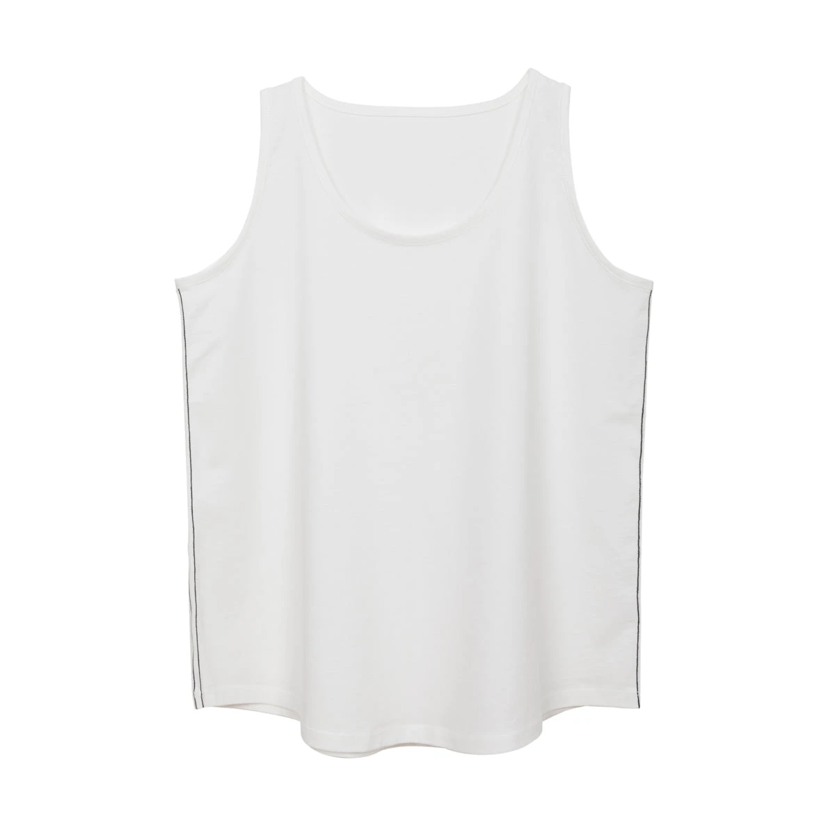 Perfect for the warmer evenings, this white ladies pyjama vest top has a loose fit for a comfy and cool night time feel. The contrasting navy side stitching detailing makes a stylish statement and pairs perfectly with our summer pyjama shorts which are available in our popular Bees, Giraffe, Zebra and Sheep designs.Â