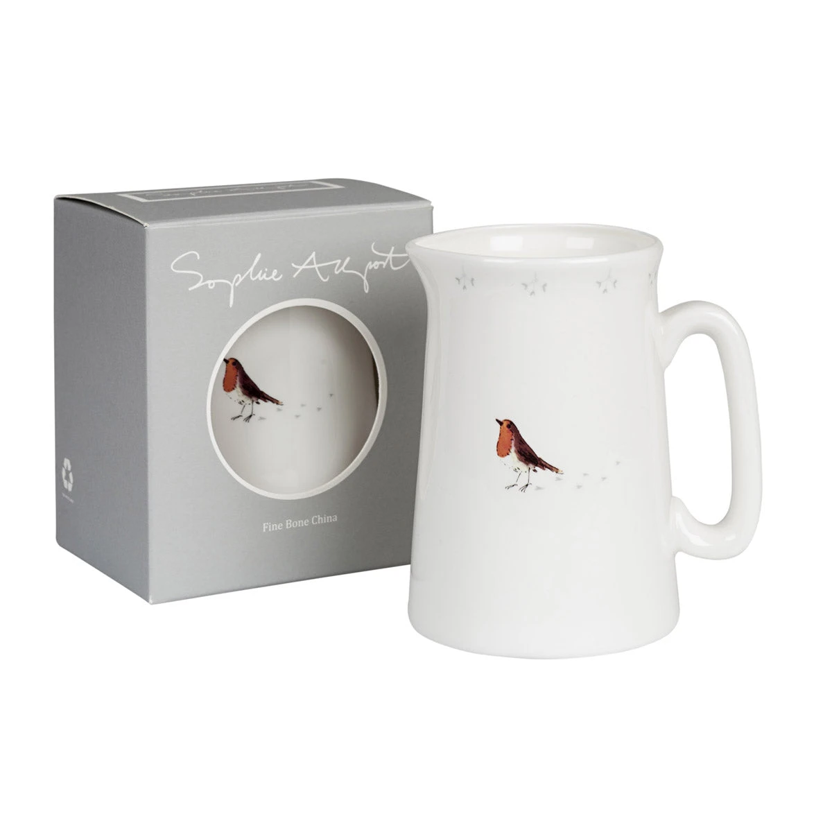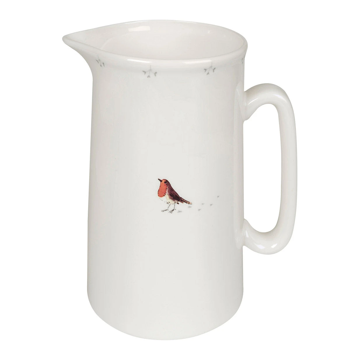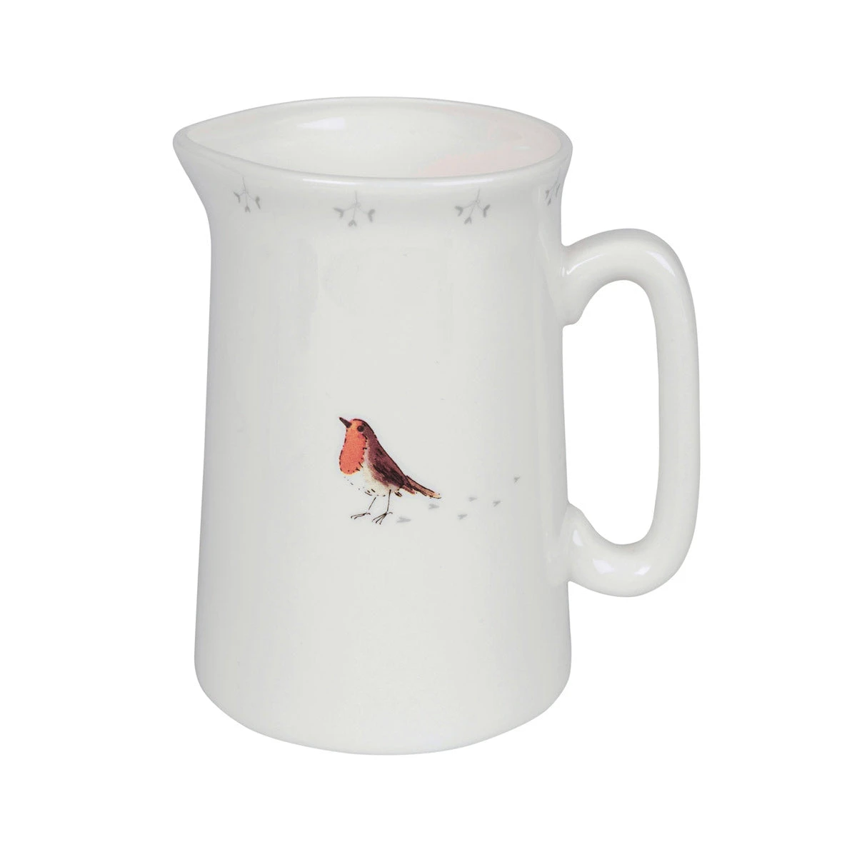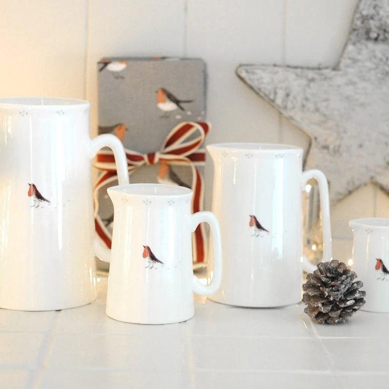 A red-breasted Robin stands on the front and back of these fine bone china white jugs. There are some sprigs of mistletoe around the top rim of each jug. Available in four sizes – mini, small, medium, and large.