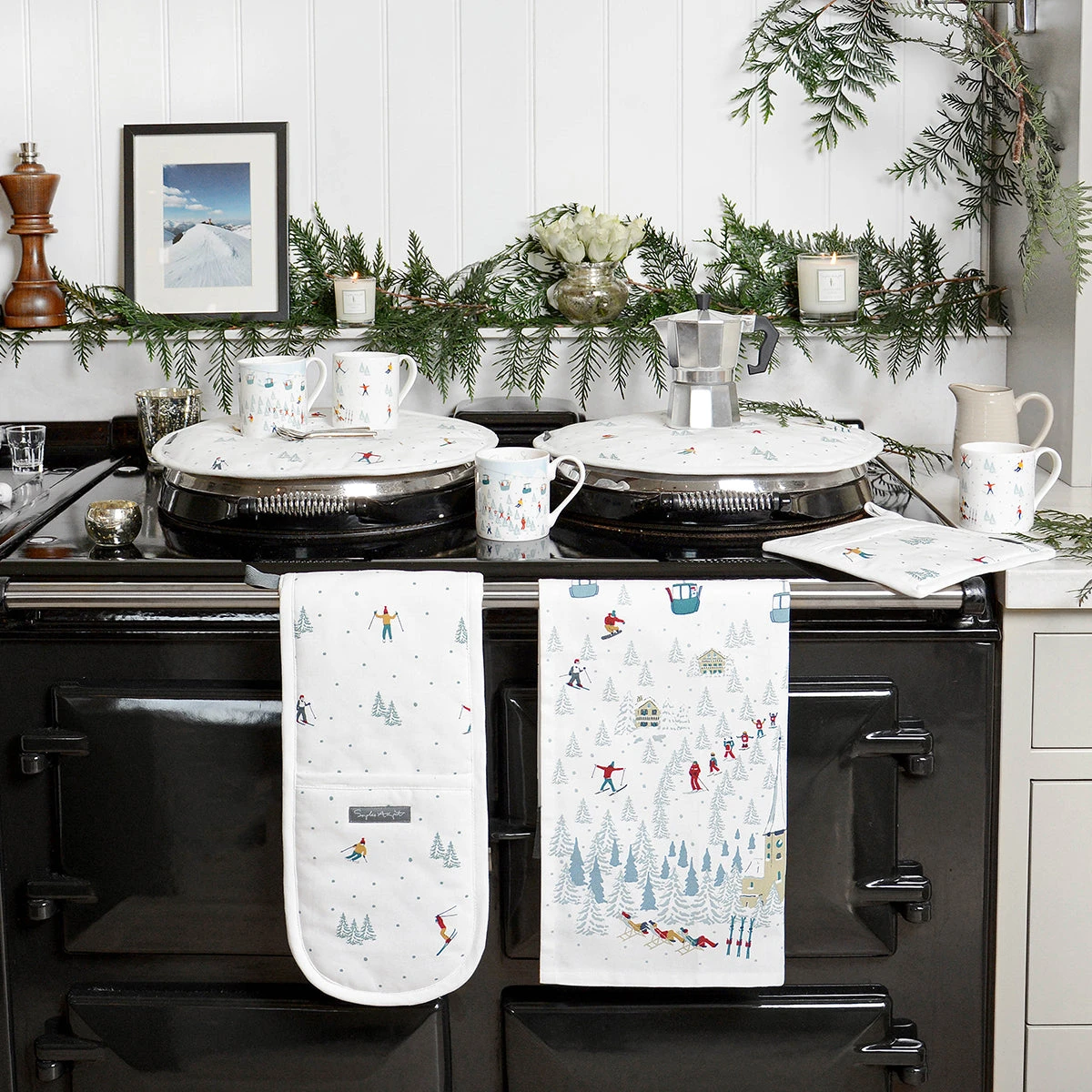 This set of 2 tea towels brings Alpine charm to your kitchen. One towel features a blissful mountain scene with skiers and snowboarders dodging snow-capped fir trees, while the other shows colourful skiers dotted along a snowy mountain. There is a handy ‘loop’ in the top left corner of each tea towel, so you can hang them up in your kitchen.