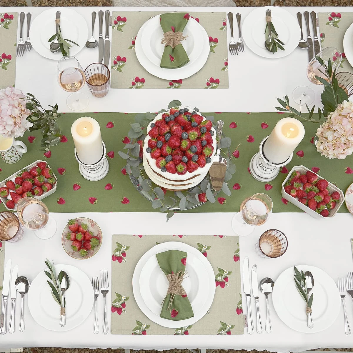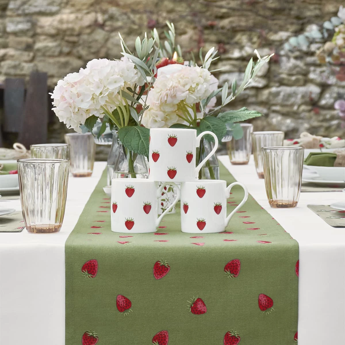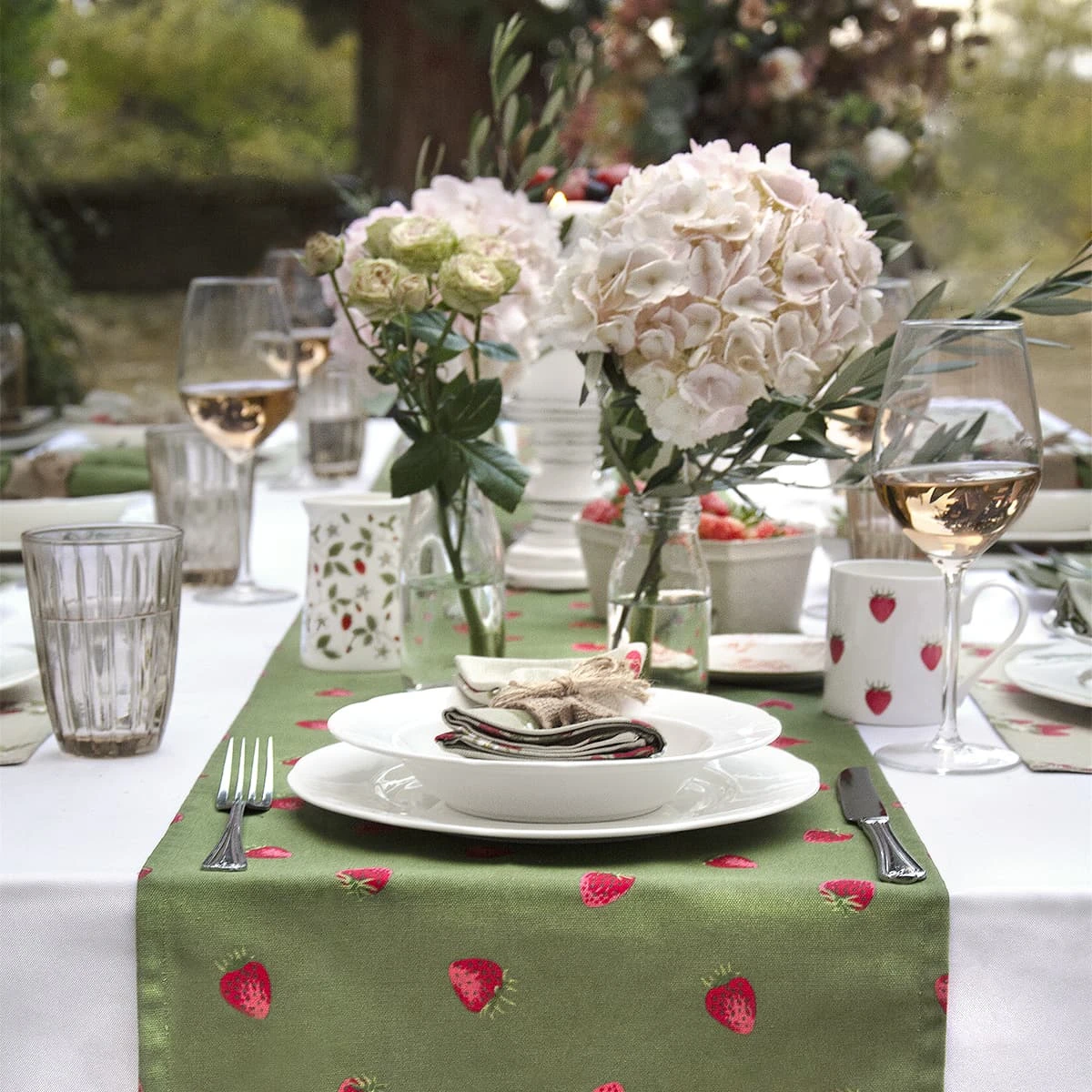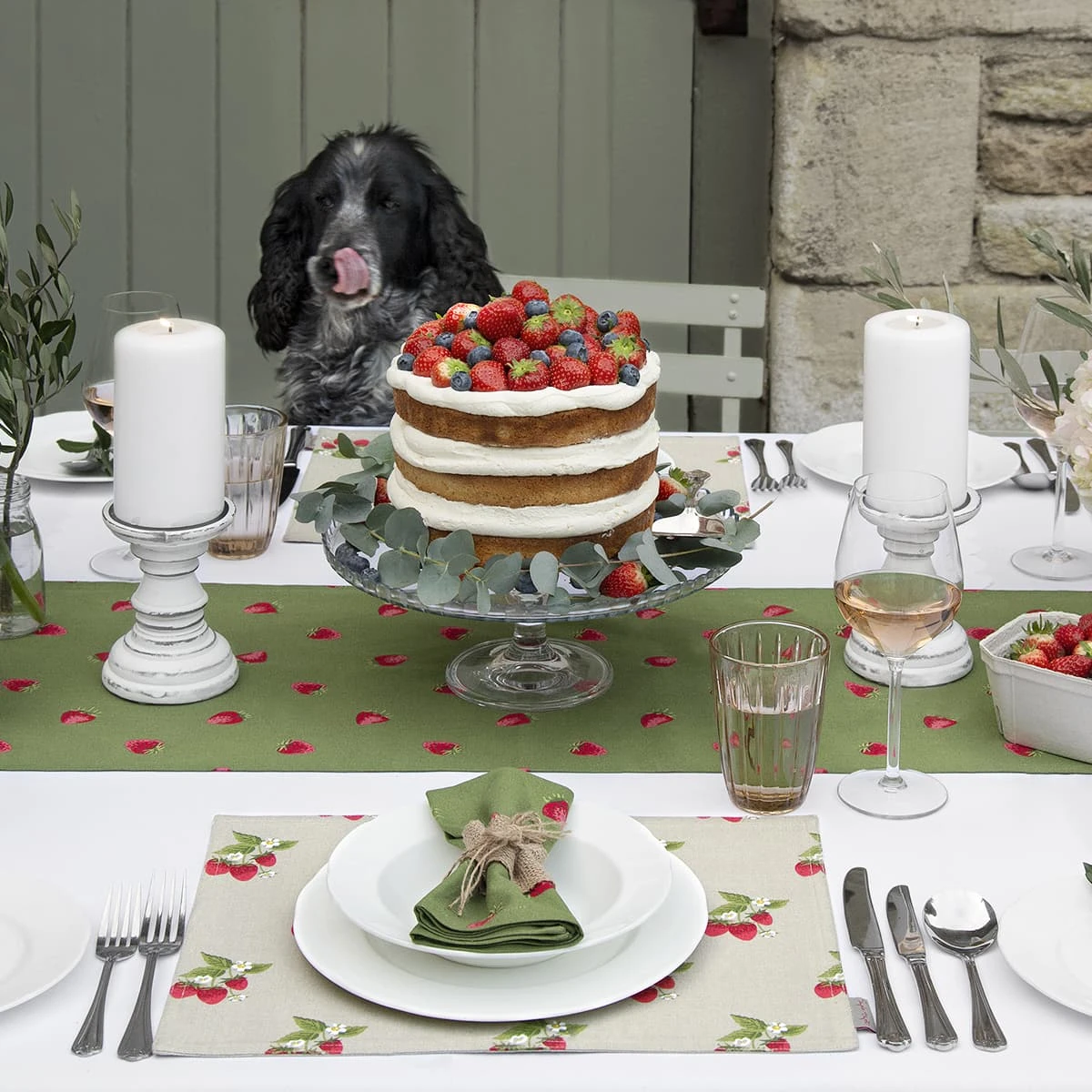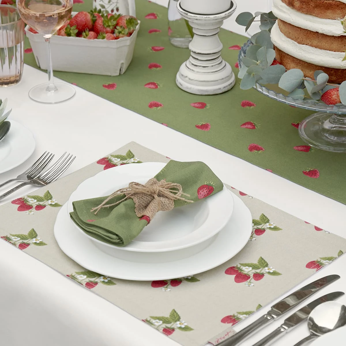 Add a fruity twist to your tablescaping this year with this vibrant table runner which will certainly add a touch of sweetness to any occasion. Featuring juicy solo strawberries on a punchy olive background, it pairs perfectly with the matching Strawberries fabric placemats and napkins for a ‘berry’ stylish table setting.