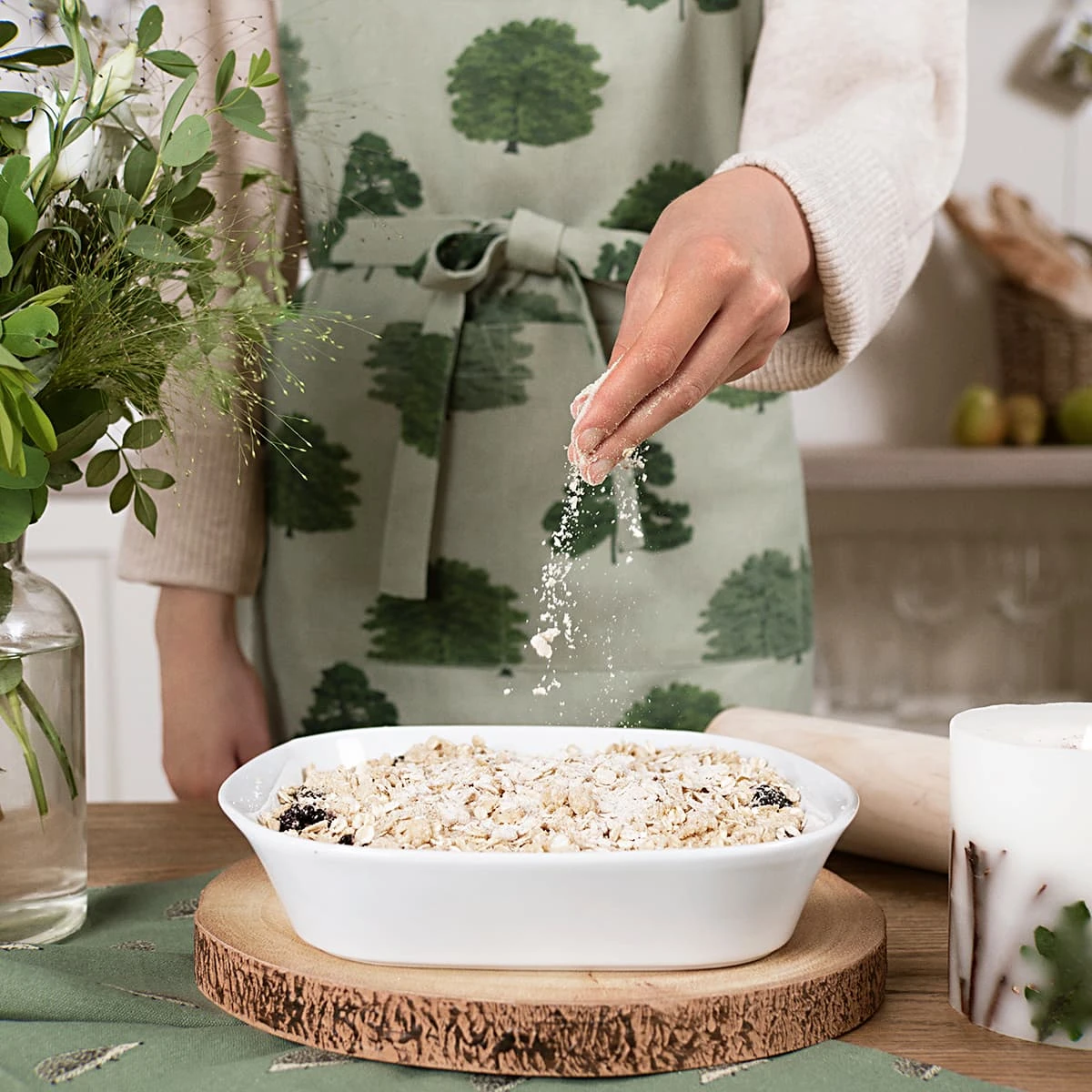 A fresh and floral apron adorned with Sophie’s hand painted Blossom print. Created with the National Trust, the apron captures the freshness of spring beautifully with its soft pink and green tones and multi-directional print. The front pocket is handy for keeping utensils close to hand while cooking or baking.