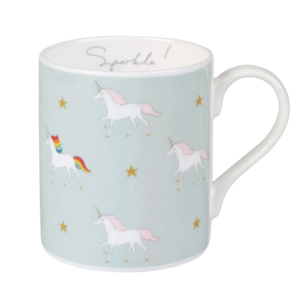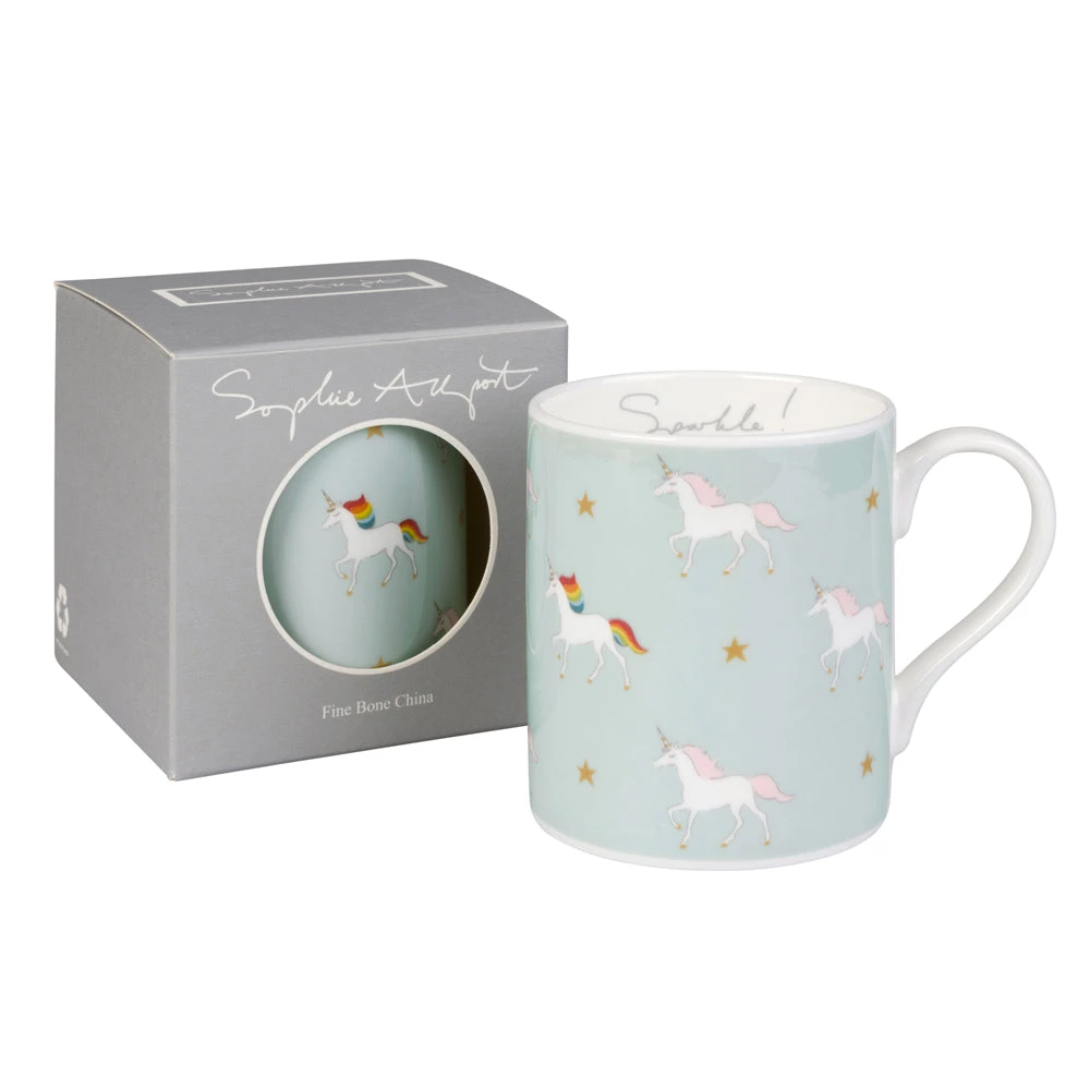 Trotting around against a chalky blue coloured background, graceful unicorns are surrounded by golden stars on this delightful fine bone china mug. Luscious manes and tails are a decadent candyfloss pink, with the occasional magical rainbow unicorn to be spotted. The perfect gift for a bubbly and flamboyant friend.