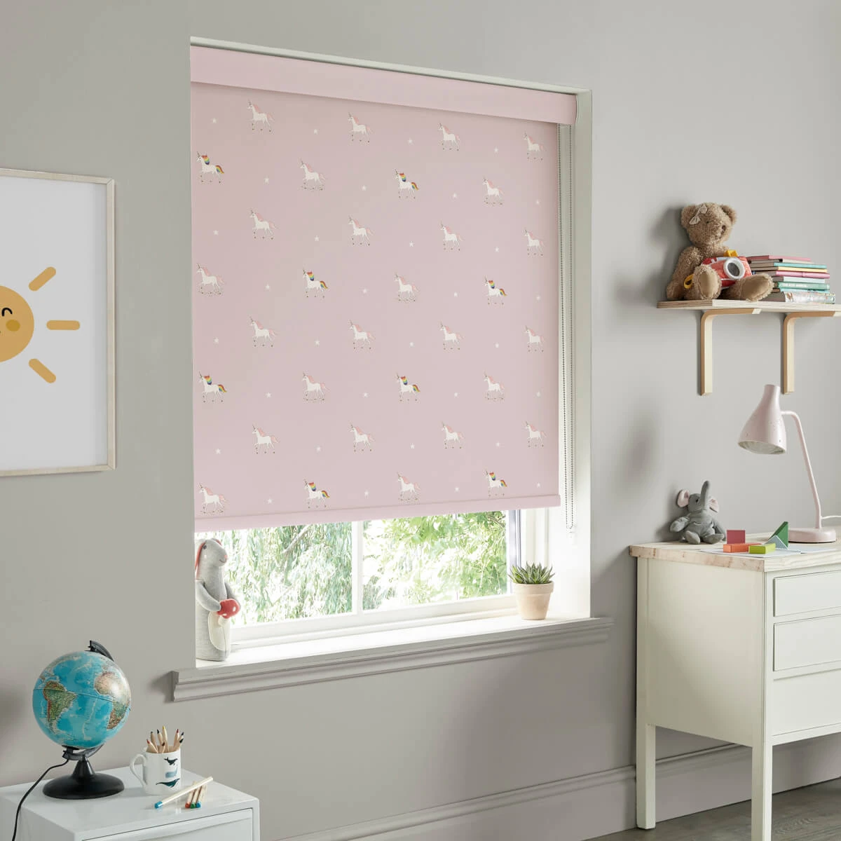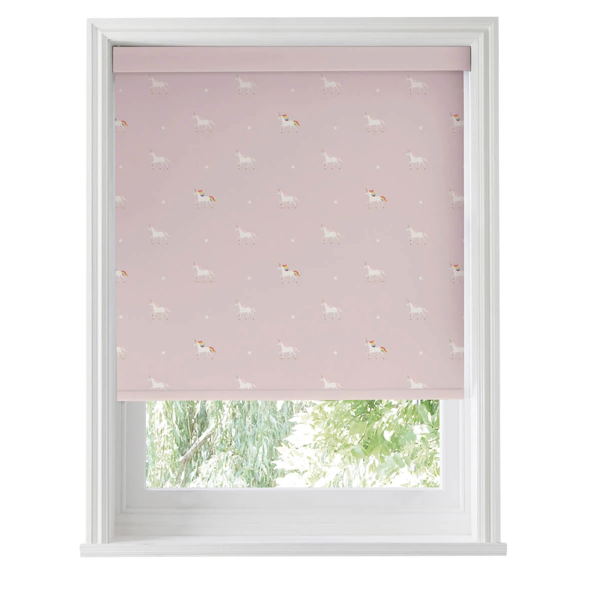 Radiant unicorns trot gracefully across a soft pink coloured background on this magical roller blind. Luscious manes and tails are a decadent candyfloss pink, with the occasional magical rainbow unicorn to be spotted. Perfect for anyone who loves unicorns, it’s sure to add sparkle to any children’s bedroom.Â