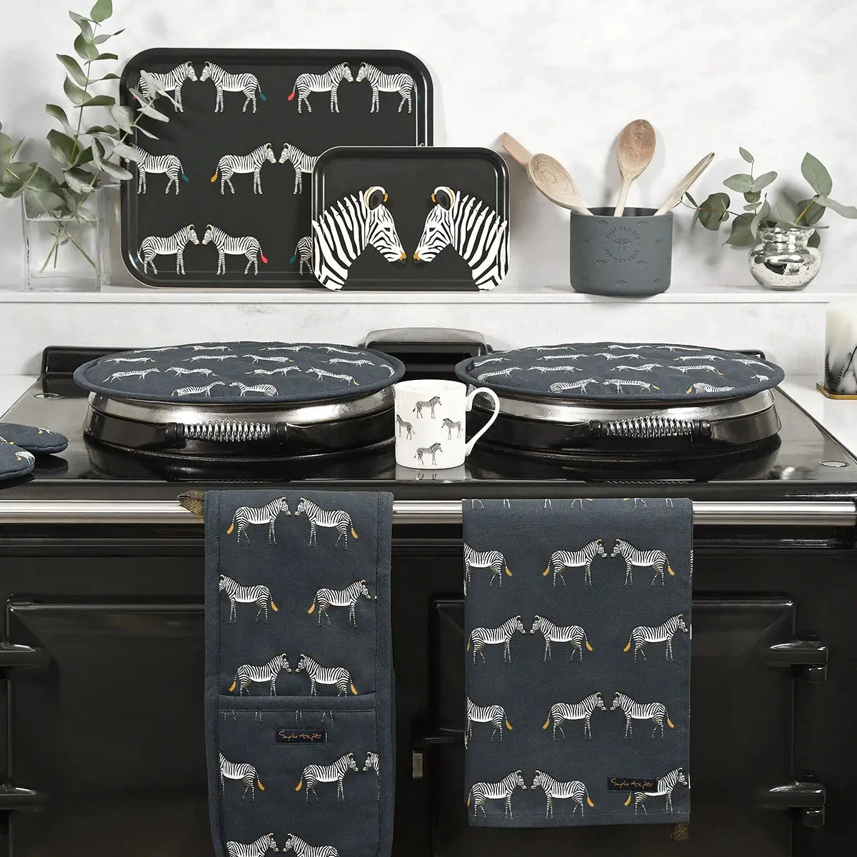 These handy double oven gloves are both practical and stylish, and feature beautifully striped zebras with mustard yellow tails on a navy charcoal background. The reverse of the glove and inside each hand pocket has a polyester thermal layer for extra protection and there is also a handy ‘loop’ in the middle of the glove, so you can hang it up in your kitchen.